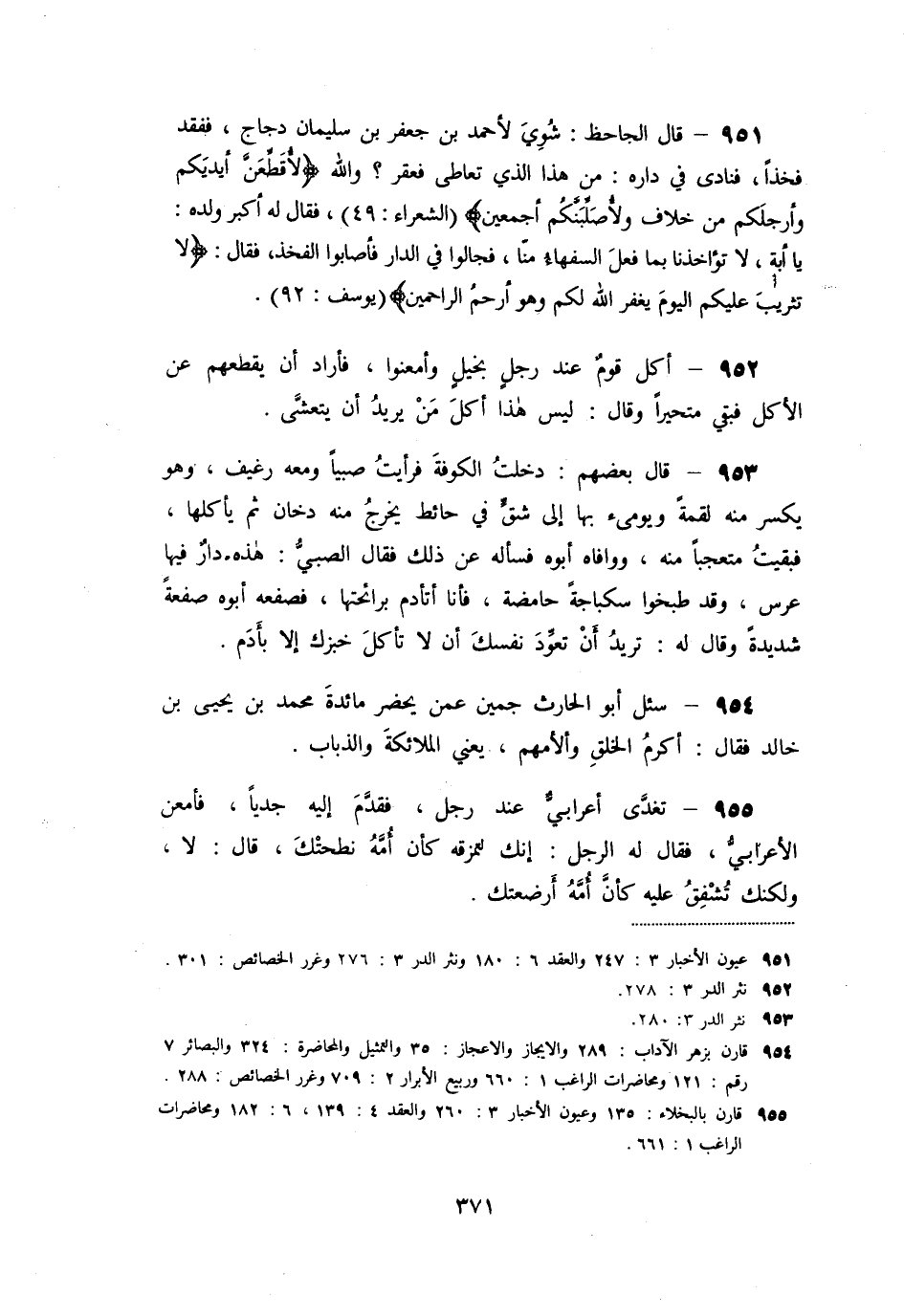 «954» - سئل أبو الحارث جمين عمن يحضر مائدة محمد بن يحيى بن خالد فقال: أكرم الخلق والأمهم، يعني الملائكة والذباب.