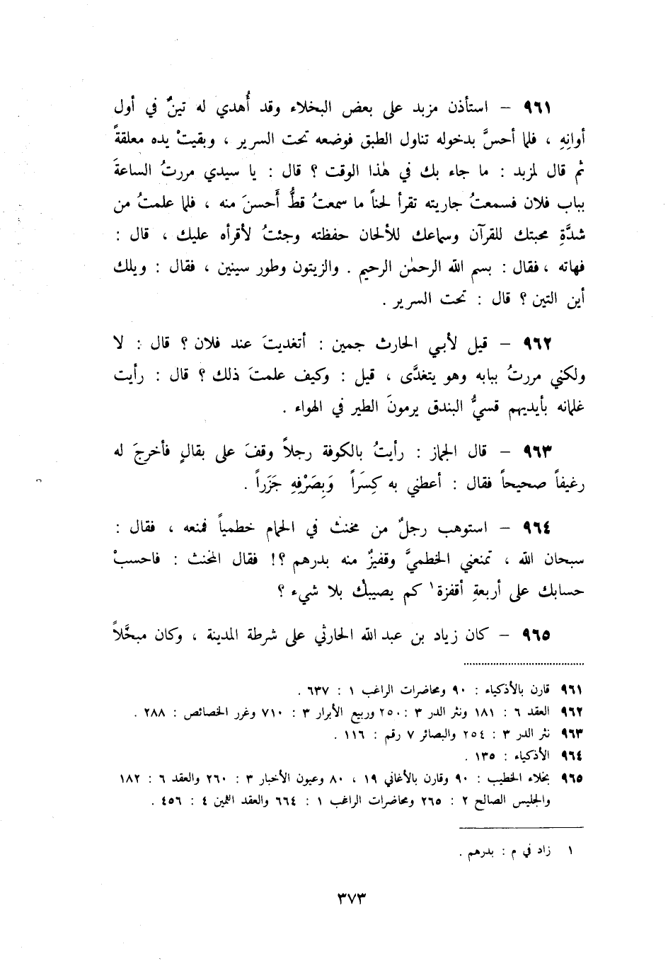 «961» - استأذن مزبد على بعض البخلاء وقد أهدي له تين في أول أوانه، فلما أحسّ بدخوله تناول الطبق فوضعه تحت السرير، وبقيت يده معلقة ثم قال لمزبد: ما جاء بك في هذا الوقت؟ قال: يا سيدي مررت الساعة بباب فلان فسمعت جاريته تقرأ لحنا ما سمعت قطّ أحسن منه، فلما علمت من شدّة محبتك للقرآن وسماعك للألحان حفظته وجئت لأقرأه عليك، قال: