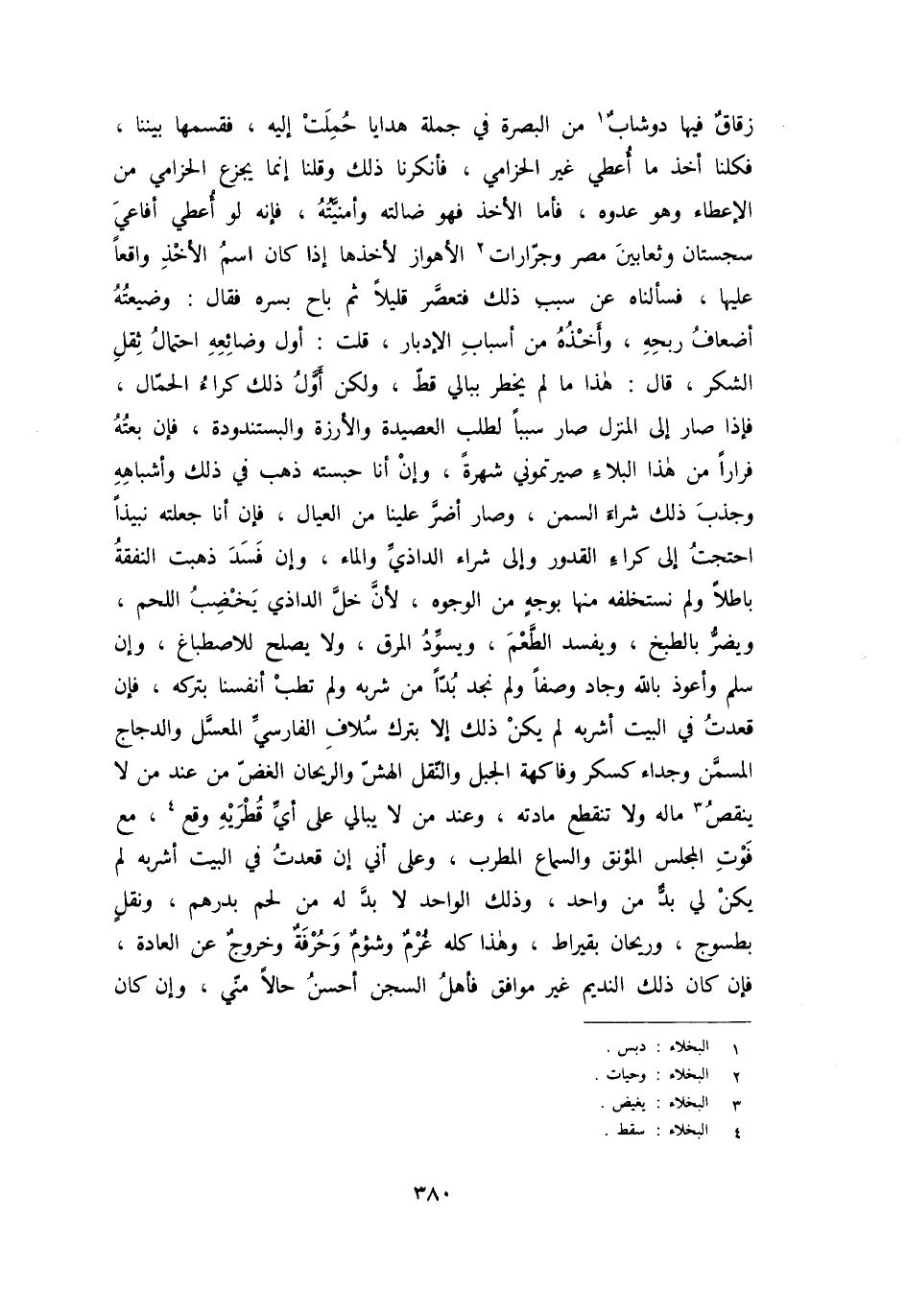 زقاق فيها دوشاب [1] من البصرة في جملة هدايا حملت إليه، فقسمها بيننا، فكلنا أخذ ما أعطي غير الحزامي، فأنكرنا ذلك وقلنا إنما يجزع الحزامي من الإعطاء وهو عدوه، فأما الأخذ فهو ضالته وأمنيّته، فإنه لو أعطي أفاعي سجستان وثعابين مصر وجرّارات [2] الأهواز لأخذها إذا كان اسم الأخذ واقعا عليها، فسألناه عن سبب ذلك فتعصّر قليلا ثم باح بسره فقال: وضيعته أضعاف ربحه، وأخذه من أسباب الإدبار، قلت: أول وضائعه احتمال ثقل الشكر، قال: هذا ما لم يخطر ببالي قطّ، ولكن أوّل ذلك كراء الحمّال، فإذا صار إلى المنزل صار سببا لطلب العصيدة والأرزة والبستندودة، فإن بعته فرارا من هذا البلاء صيرتموني شهرة، وإن أنا حبسته ذهب في ذلك وأشباهه وجذب ذلك شراء السمن، وصار أضرّ علينا من العيال، فإن أنا جعلته نبيذا احتجت إلى كراء القدور وإلى شراء الداذيّ والماء، وإن فسد ذهبت النفقة باطلا ولم نستخلفه منها بوجه من الوجوه، لأنّ خلّ الداذيّ يخضب اللحم، ويضرّ بالطبخ، ويفسد الطّعم، ويسوّد المرق، ولا يصلح للاصطباغ، وإن سلم وأعوذ بالله وجاد وصفا ولم نجد بدّا من شربه ولم تطب أنفسنا بتركه، فإن قعدت في البيت أشربه لم يكن ذلك إلا بترك سلاف الفارسيّ المعسّل والدجاج المسمّن وجداء كسكر وفاكهة الجبل والنّقل الهشّ والريحان الغضّ من عند من لا ينقص [3] ماله ولا تنقطع مادته، وعند من لا يبالي على أيّ قطريه وقع [4] ، مع فوت المجلس المؤنق والسماع المطرب، وعلى أني إن قعدت في البيت أشربه لم يكن لي بدّ من واحد، وذلك الواحد لا بدّ له من لحم بدرهم، ونقل بطسوج، وريحان بقيراط، وهذا كله غرم وشؤم وحرفة وخروج عن العادة، فإن كان ذلك النديم غير موافق فأهل السجن أحسن حالا منّي، وإن كان