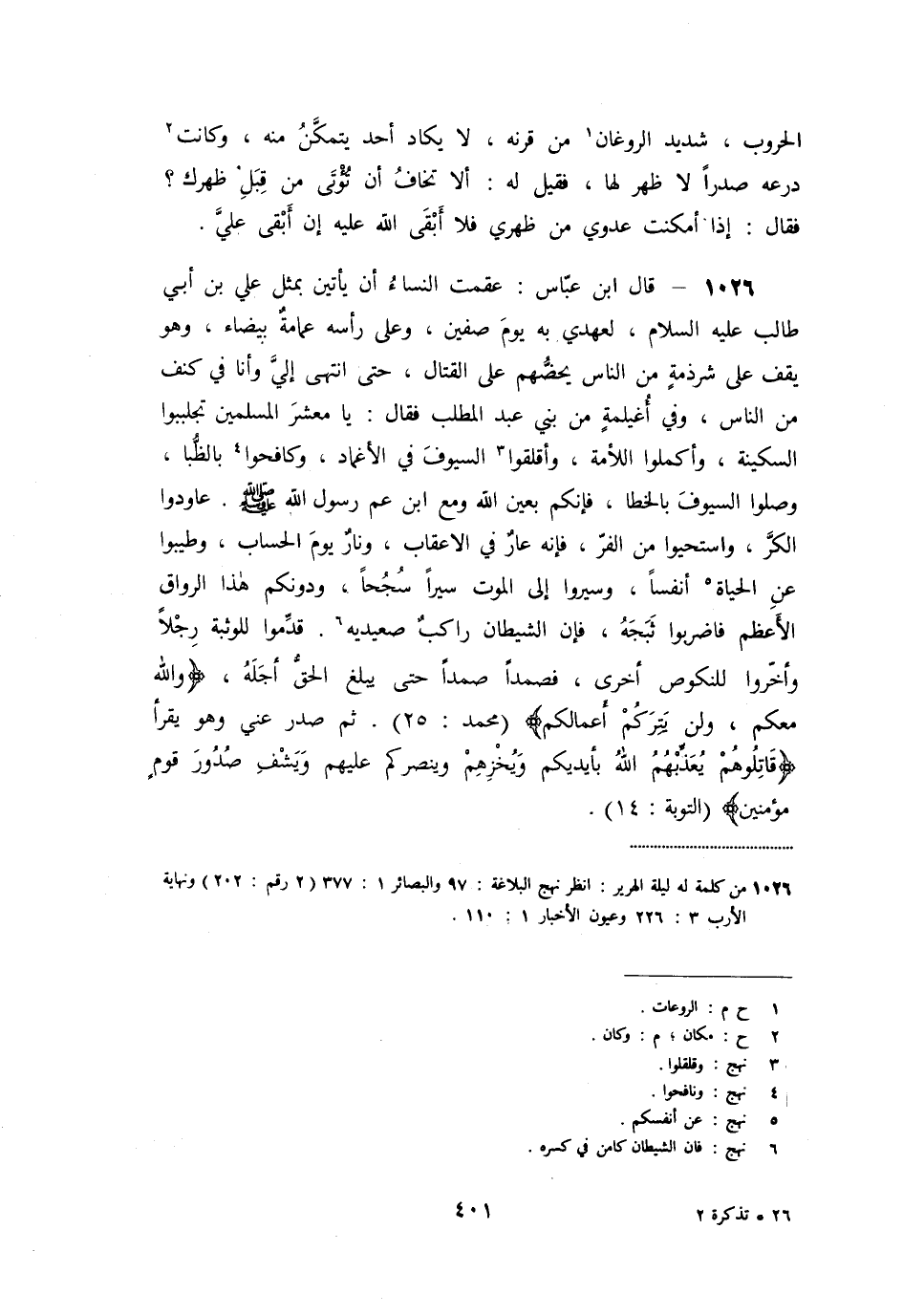 «1026» - قال ابن عبّاس: عقمت النساء أن يأتين بمثل علي بن أبي طالب عليه السلام، لعهدي به يوم صفين، وعلى رأسه عمامة بيضاء، وهو يقف على شرذمة من الناس يحضّهم على القتال، حتى انتهى إليّ وأنا في كنف من الناس، وفي أغيلمة من بني عبد المطلب فقال: يا معشر المسلمين تجلببوا السكينة، وأكملوا اللأمة، وأقلقوا [3] السيوف في الأغماد، وكافحوا [4] بالظّبا، وصلوا السيوف بالخطا، فإنكم بعين الله ومع ابن عم رسول الله صلّى الله عليه وسلّم. عاودوا الكرّ، واستحيوا من الفرّ، فإنه عار في الاعقاب، ونار يوم الحساب، وطيبوا عن الحياة [5] أنفسا، وسيروا إلى الموت سيرا سجحا، ودونكم هذا الرواق الأعظم فاضربوا ثبجه، فإن الشيطان راكب صعيديه [6] . قدّموا للوثبة رجلا وأخّروا للنكوص أخرى، فصمدا صمدا حتى يبلغ الحقّ أجله، وَاللَّهُ مَعَكُمْ، وَلَنْ يَتِرَكُمْ أَعْمالَكُمْ