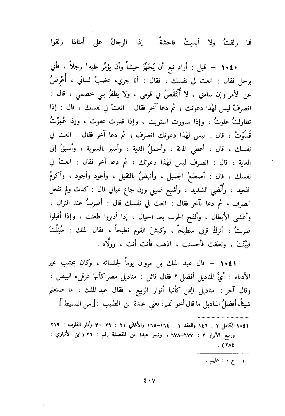 «1041» - قال عبد الملك بن مروان يوما لجلسائه، وكان يجتنب غير الأدباء: أيّ المناديل أفضل؟ فقال قائل: مناديل مصر كأنها غرقىء البيض، وقال آخر: مناديل اليمن كأنها أنوار الربيع، فقال عبد الملك: ما صنعتم شيئا، أفضل المناديل ما قال أخو تميم، يعني عبدة بن الطبيب: [من البسيط]