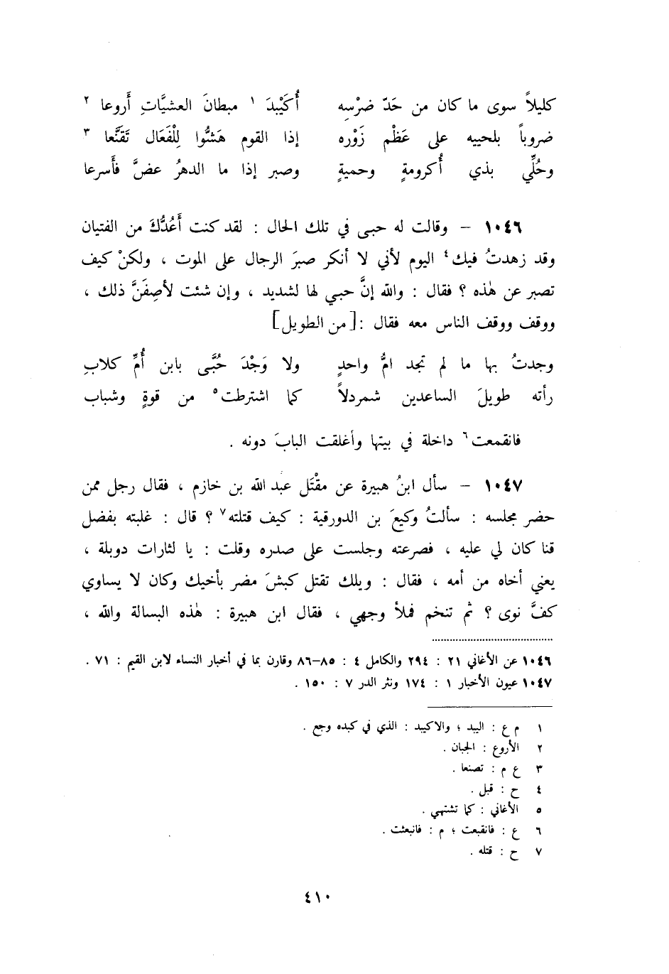 «1046» - وقالت له حبى في تلك الحال: لقد كنت أعدّك من الفتيان وقد زهدت فيك [4] اليوم لأني لا أنكر صبر الرجال على الموت، ولكن كيف تصبر عن هذه؟ فقال: والله إنّ حبي لها لشديد، وإن شئت لأصفنّ ذلك، ووقف ووقف الناس معه فقال: [من الطويل]