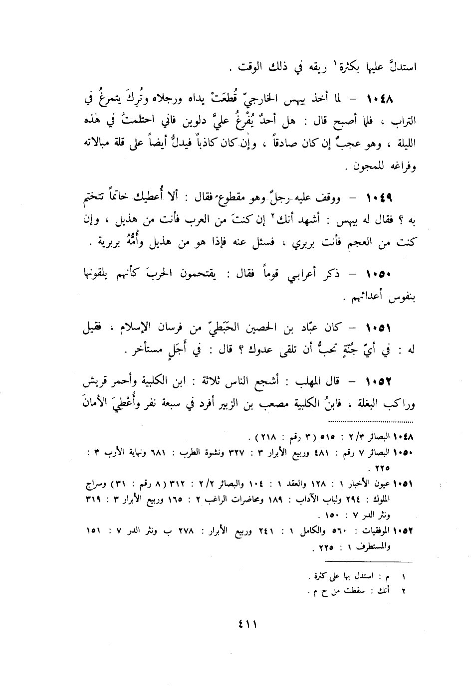 «1048» - لما أخذ بيهس الخارجيّ قطعت يداه ورجلاه وترك يتمرغ في التراب، فلما أصبح قال: هل أحد يفرغ عليّ دلوين فاني احتلمت في هذه الليلة، وهو عجب إن كان صادقا، وإن كان كاذبا فيدلّ أيضا على قلة مبالاته وفراغه للمجون.