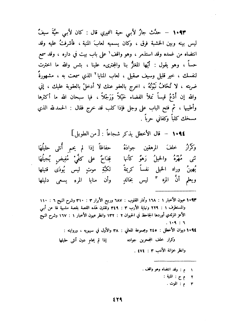 «1093» - حدّث جار لأبي حية النميري قال: كان لأبي حيّة سيف ليس بينه وبين الخشبة فرق، وكان يسميه لعاب المنية، فأشرفت عليه وقد انتضاه من غمده وقد استذمر، وهو واقف [1] على باب بيت في داره، وقد سمع حسا، وهو يقول: أيّها المغترّ بنا والمجترىء علينا، بئس والله ما اخترت لنفسك، خير قليل وسيف صقيل، لعاب المنايا [2] الذي سمعت به، مشهورة ضربته، لا تخاف نبوته، اخرج بالعفو عنك لا أدخل بالعقوبة عليك، إني والله إن أدع قيسا تملأ الفضاء خيلا ورجلا، فيا سبحان الله ما أكثرها وأطيبها، ثم فتح الباب على وجل فإذا كلب قد خرج فقال: الحمد لله الذي مسخك كلبا وكفاني حربا.