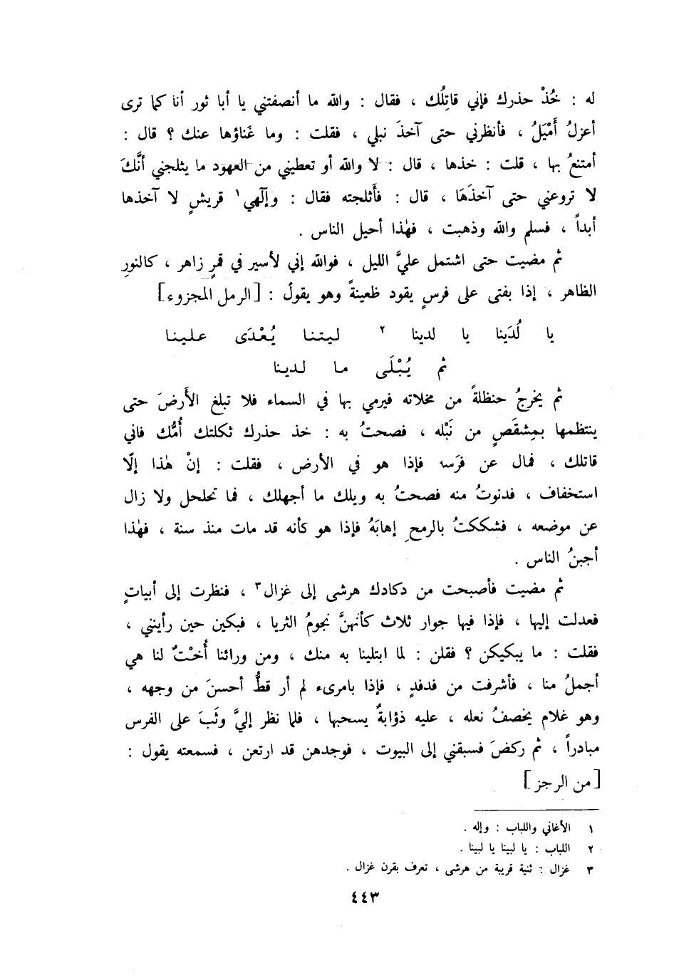 ثم مضيت حتى اشتمل عليّ الليل، فو الله إني لأسير في قمر زاهر، كالنور الظاهر، إذا بفتى على فرس يقود ظعينة وهو يقول: [الرمل المجزوء]