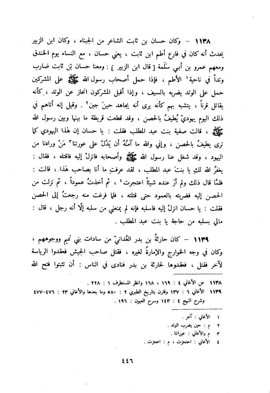 فلمّا قال ذلك ولم أر عنده شيئا اعتجرت [4] ، ثم أخذت عمودا، ثم نزلت من الحصن إليه فضربته بالعمود حتى قتلته، فلما فرغت منه رجعت إلى الحصن فقلت: يا حسان انزل إليه فاسلبه فإنه لم يمنعني من سلبه إلّا أنه رجل، قال: