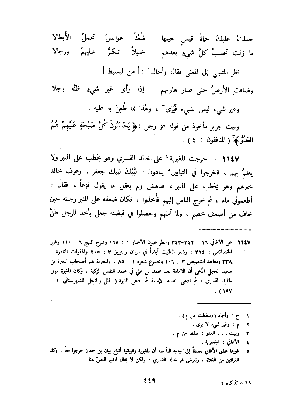 [5] غيرها محقق الأغاني تعسفا إلى البيانية ظنا منه أن المغيرية والبيانية أتباع بيان بن سمعان خرجوا معا، وكلتا الفرقتين من الغلاة، وتعرض لهما خالد القسري، ولكن لا مجال لتغيير النصّ هنا.