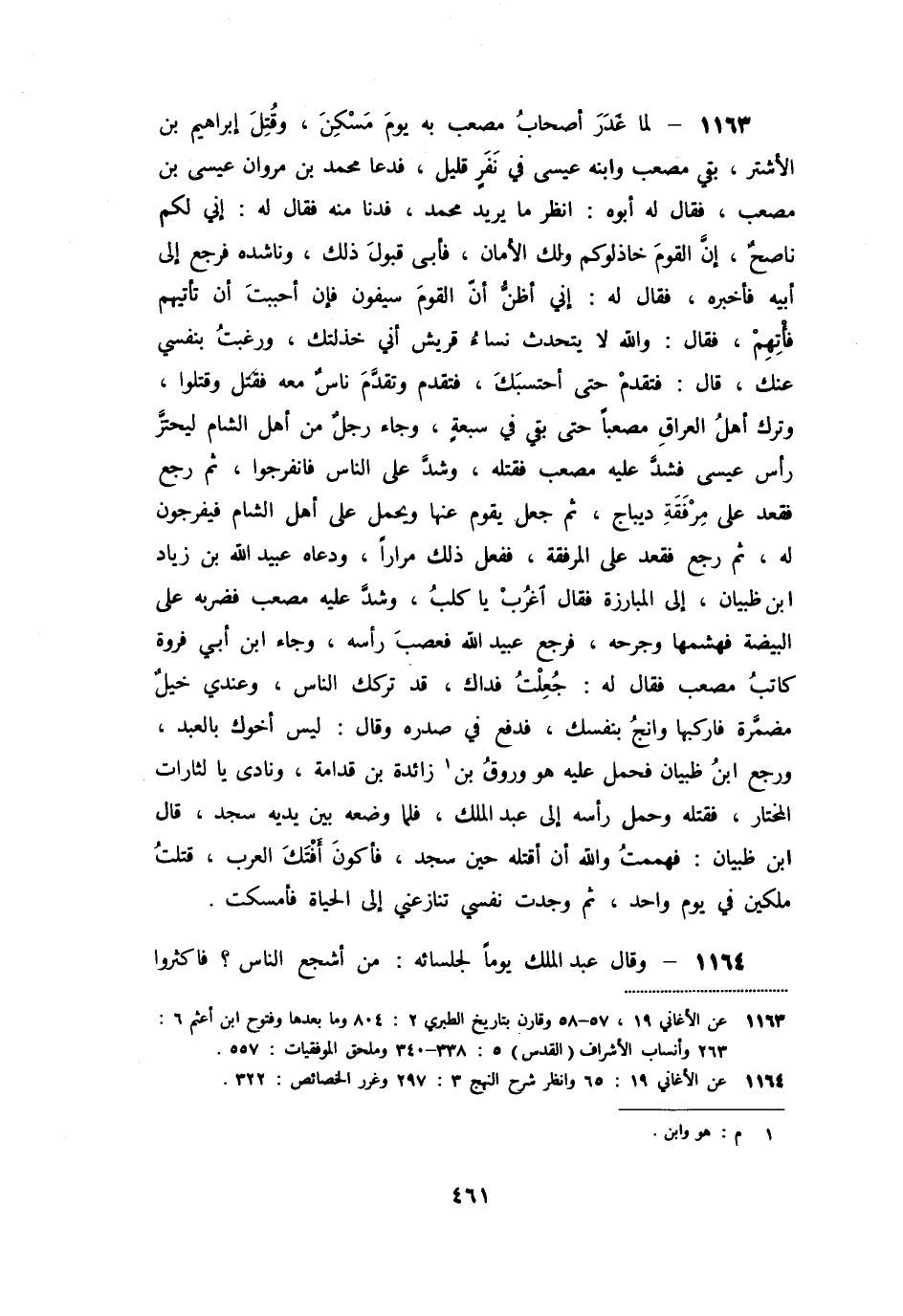 «1163» لما غدر أصحاب مصعب به يوم مسكن، وقتل إبراهيم بن الأشتر، بقي مصعب وابنه عيسى في نفر قليل، فدعا محمد بن مروان عيسى بن مصعب، فقال له أبوه: انظر ما يريد محمد، فدنا منه فقال له: إني لكم ناصح، إنّ القوم خاذلوكم ولك الأمان، فأبى قبول ذلك، وناشده فرجع إلى أبيه فأخبره، فقال له: إني أظنّ أنّ القوم سيفون فإن أحببت أن تأتيهم فأتهم، فقال: والله لا يتحدث نساء قريش أني خذلتك، ورغبت بنفسي عنك، قال: فتقدم حتى أحتسبك، فتقدم وتقدّم ناس معه فقتل وقتلوا، وترك أهل العراق مصعبا حتى بقي في سبعة، وجاء رجل من أهل الشام ليحتزّ رأس عيسى فشدّ عليه مصعب فقتله، وشدّ على الناس فانفرجوا، ثم رجع فقعد على مرفقة ديباج، ثم جعل يقوم عنها ويحمل على أهل الشام فيفرجون له، ثم رجع فقعد على المرفقة، ففعل ذلك مرارا، ودعاه عبيد الله بن زياد ابن ظبيان، إلى المبارزة فقال أغرب يا كلب، وشدّ عليه مصعب فضربه على البيضة فهشمها وجرحه، فرجع عبيد الله فعصب رأسه، وجاء ابن أبي فروة كاتب مصعب فقال له: جعلت فداك، قد تركك الناس، وعندي خيل مضمّرة فاركبها وانج بنفسك، فدفع في صدره وقال: ليس أخوك بالعبد، ورجع ابن ظبيان فحمل عليه هو وروق بن [1] زائدة بن قدامة، ونادى يا لثارات المختار، فقتله وحمل رأسه إلى عبد الملك، فلما وضعه بين يديه سجد، قال ابن ظبيان: فهممت والله أن أقتله حين سجد، فأكون أفتك العرب، قتلت ملكين في يوم واحد، ثم وجدت نفسي تنازعني إلى الحياة فأمسكت.