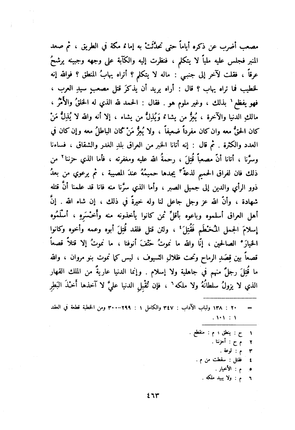 مصعب أضرب عن ذكره أياما حتى تحدّثت به إماء مكة في الطريق، ثم صعد المنبر فجلس عليه مليا لا يتكلم، فنظرت إليه والكآبة على وجهه وجبينه يرشح عرقا، فقلت لآخر إلى جنبي: ماله لا يتكلم؟ أتراه يهاب المنطق؟ فو الله إنه لخطيب فما تراه يهاب؟ قال: أراه يريد أن يذكر قتل مصعب سيد العرب، فهو يفظع [1] بذلك، وغير ملوم هو. فقال: الحمد لله الذي له الخلق والأمر، مالك الدنيا والآخرة، يعزّ من يشاء ويذلّ من يشاء، إلا أنه والله لا يذلّ من كان الحقّ معه وان كان مفردا ضعيفا، ولا يعزّ من كان الباطل معه وإن كان في العدد والكثرة. ثم قال: إنه أتانا الخبر من العراق بلد الغدر والشقاق، فساءنا وسرّنا، أتانا أنّ مصعبا قتل، رحمة الله عليه ومغفرته، فأما الذي حزننا [2] من ذلك فان لفراق الحميم لذعة [3] يجدها حميمه عند المصيبة، ثم يرعوي من بعد ذوو الرأي والدين إلى جميل الصبر، وأما الذي سرّنا منه فانا قد علمنا أنّ قتله شهادة، وأنّ الله عز وجل جاعل لنا وله خيرة في ذلك، إن شاء الله. إنّ أهل العراق أسلموه وباعوه بأقلّ ثمن كانوا يأخذونه منه وأخسره، أسلموه إسلام الجمل المخطم فقتل [4] ، ولئن قتل فلقد قتل أبوه وعمه وأخوه وكانوا الخيار [5] الصالحين، إنّا والله ما نموت حتف أنوفنا، ما نموت إلا قتلا قصعا قصعا بين قصد الرماح وتحت ظلال السيوف، ليس كما تموت بنو مروان، والله ما قتل رجل منهم في جاهلية ولا إسلام. وإنما الدنيا عارية من الملك القهار الذي لا يزول سلطانه ولا ملكه [6] ، فإن تقبل الدنيا عليّ لا آخذها أخذ البطر