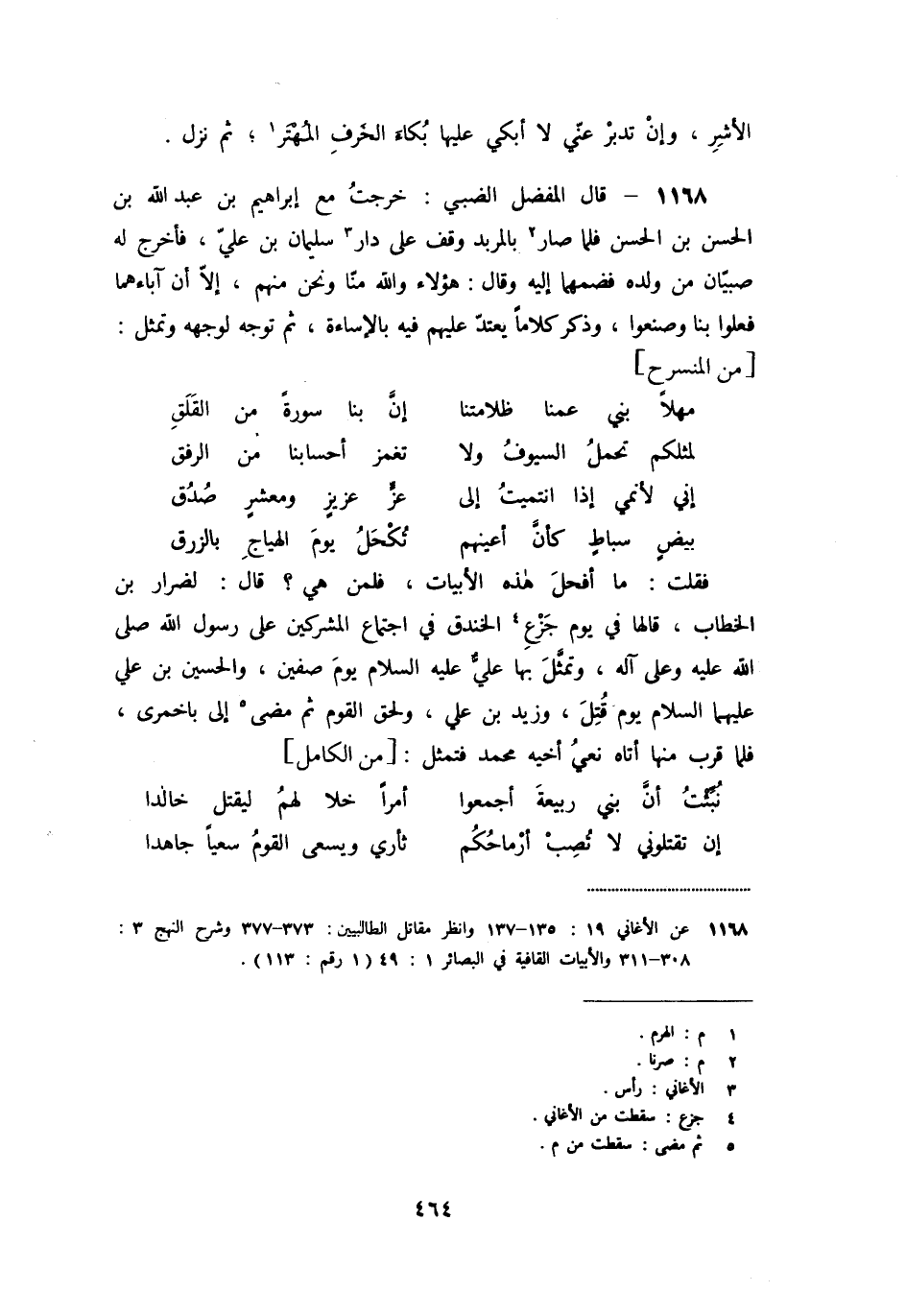 - قال المفضل الضبي: خرجت مع إبراهيم بن عبد الله بن الحسن بن الحسن فلما صار [2] بالمربد وقف على دار [3] سليمان بن عليّ، فأخرج له صبيّان من ولده فضمهما إليه وقال: هؤلاء والله منّا ونحن منهم، إلّا أن آباءهما فعلوا بنا وصنعوا، وذكر كلاما يعتدّ عليهم فيه بالإساءة، ثم توجه لوجهه وتمثل: