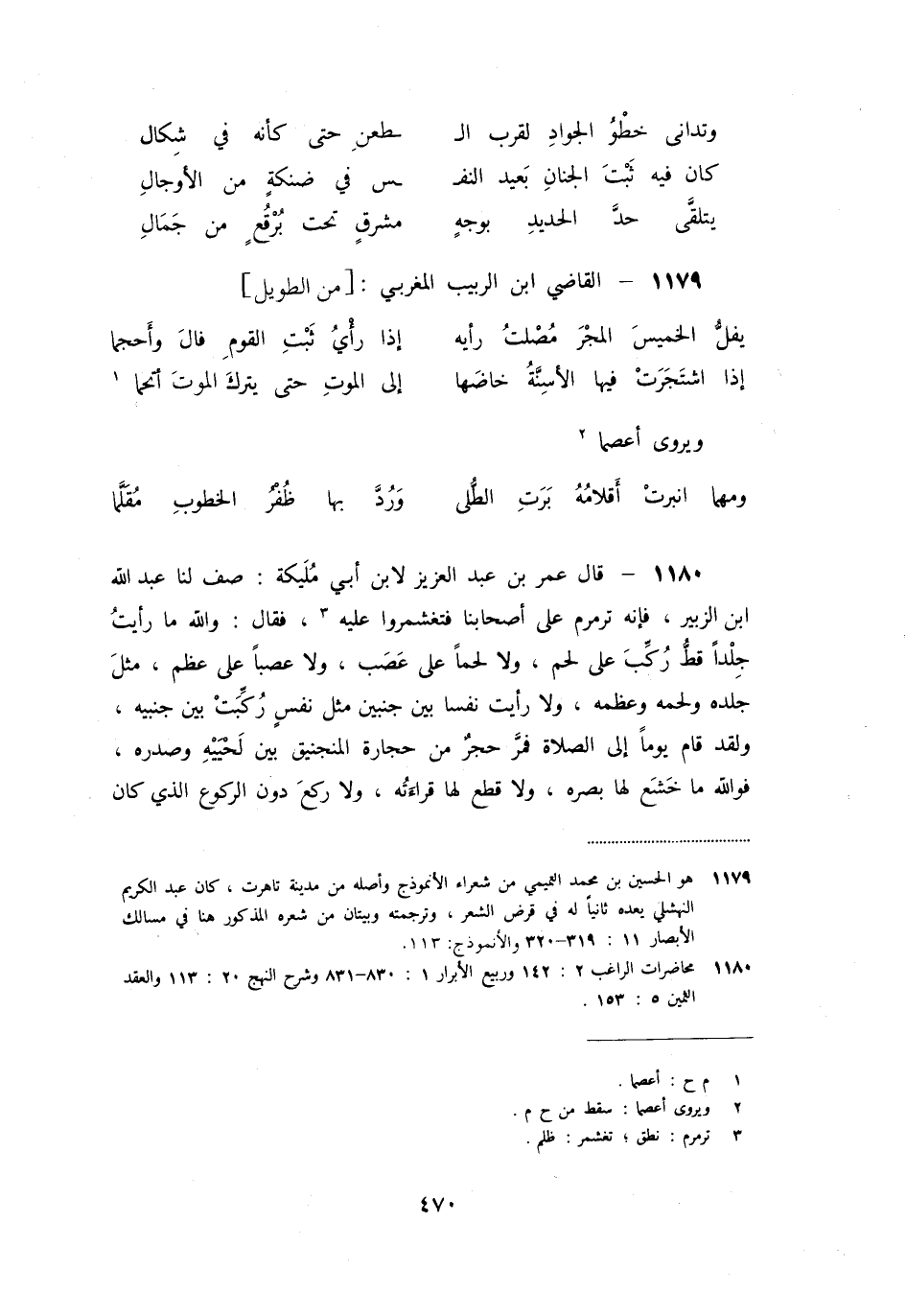 «1180» - قال عمر بن عبد العزيز لابن أبي مليكة: صف لنا عبد الله ابن الزبير، فإنه ترمرم على أصحابنا فتغشمروا عليه [3] ، فقال: والله ما رأيت جلدا قطّ ركّب على لحم، ولا لحما على عصب، ولا عصبا على عظم، مثل جلده ولحمه وعظمه، ولا رأيت نفسا بين جنبين مثل نفس ركّبت بين جنبيه، ولقد قام يوما إلى الصلاة فمرّ حجر من حجارة المنجنيق بين لحييه وصدره، فو الله ما خشع لها بصره، ولا قطع لها قراءته، ولا ركع دون الركوع الذي كان