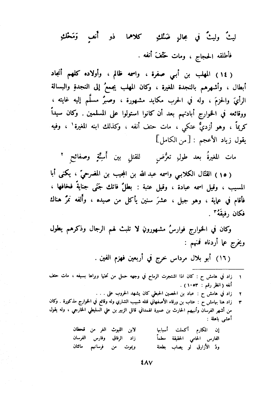 [3] زاد هنا بهامش ح: عتاب بن ورقاء الأصفهاني قتله شبيب الشاري وله وقائع في الخوارج مذكورة. وكان من أشهر الفرسان وأنبههم الحارث بن عميرة الهمداني قاتل الزبير بن علي السليطي الخارجي، وله يقول أعشى باهلة:
