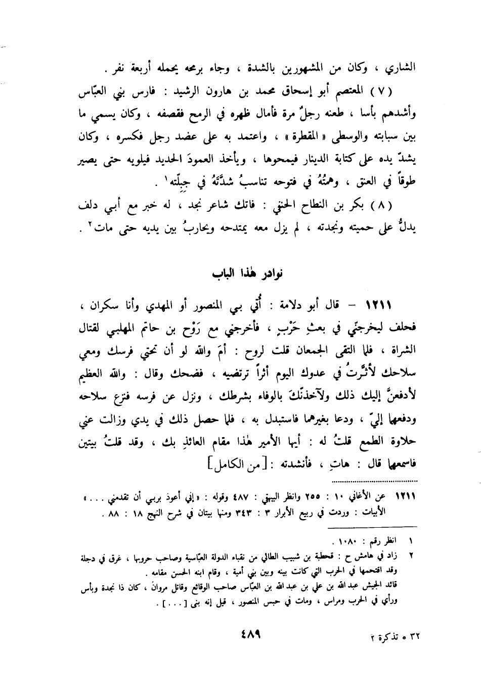 (8) بكر بن النطاح الحنفي: فاتك شاعر نجد، له خبر مع أبي دلف يدلّ على حميته ونجدته، لم يزل معه يمتدحه ويحارب بين يديه حتى مات [2] .