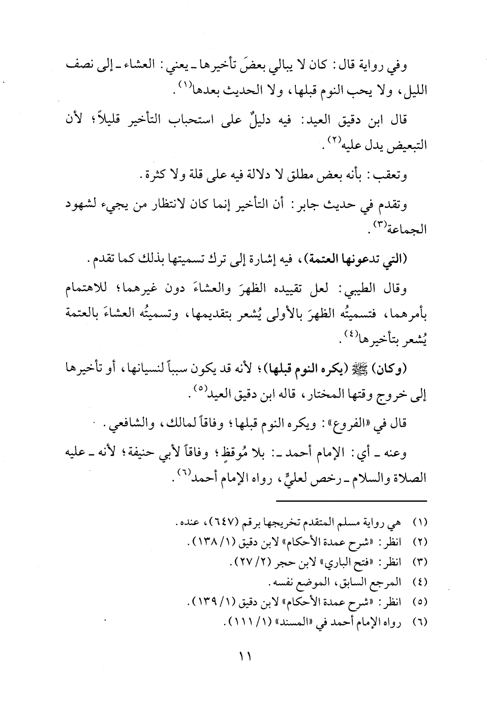 وفي رواية قال: كان لا يبالي بعضَ تأخيرها -يعني: العشاء- إلى نصف الليل، ولا يحب النوم قبلها، ولا الحديث بعدها (١).