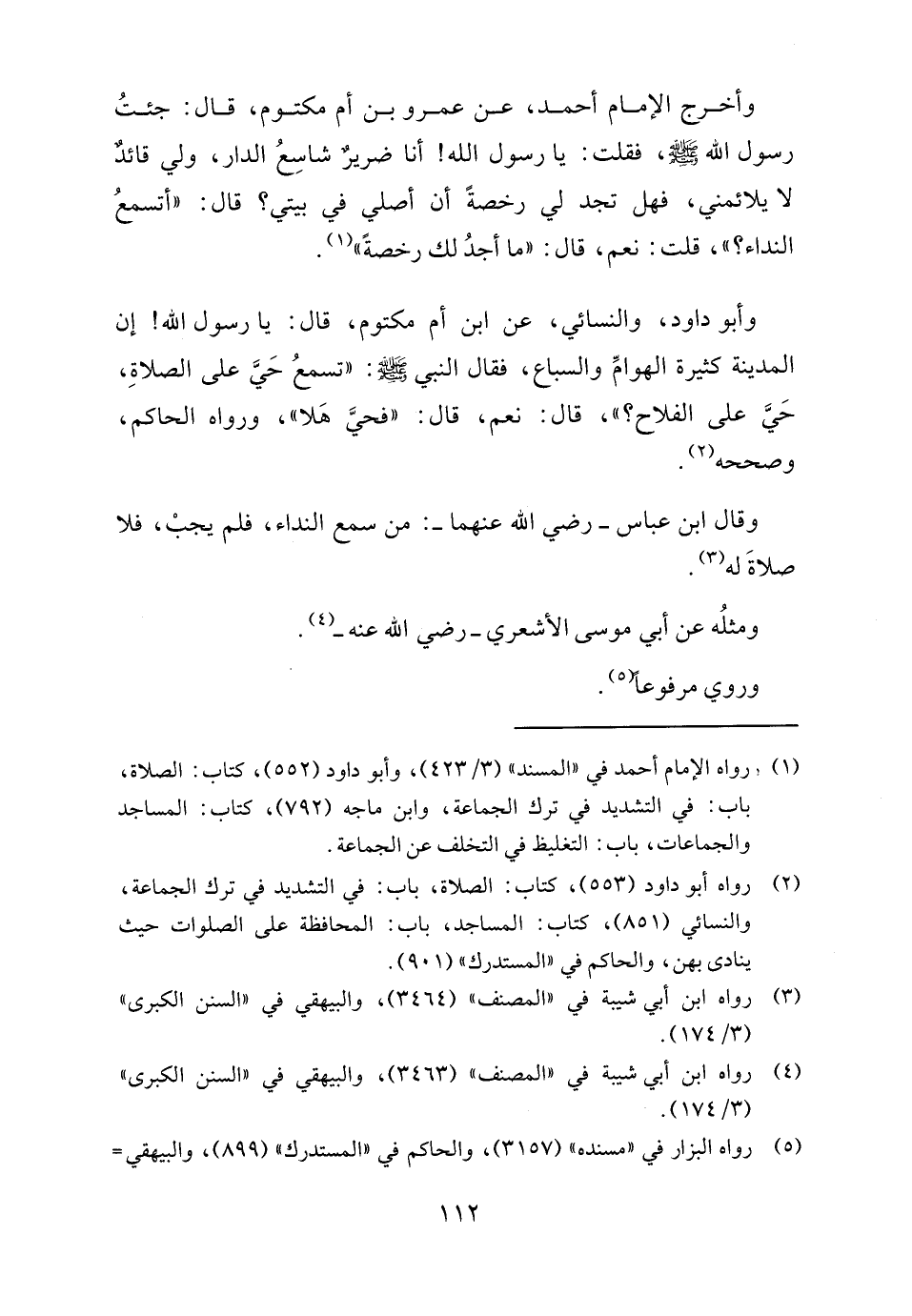(٢) رواه أبو داود (٥٥٣)، كتاب: الصلاة، باب: في التشديد في ترك الجماعة، والنسائي (٨٥١)، كتاب: المساجد، باب: المحافظة على الصلوات حيث ينادى بهن، والحاكم في "المستدرك" (٩٠١).