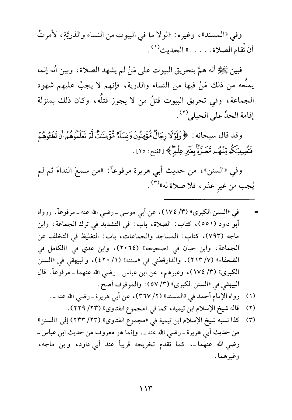 وفي "السنن"، من حديث أبي هريرة مرفوعًا: "من سمعَ النداءَ ثم لم يُجب من غيرِ عذر، فلا صلاة له" (٣).