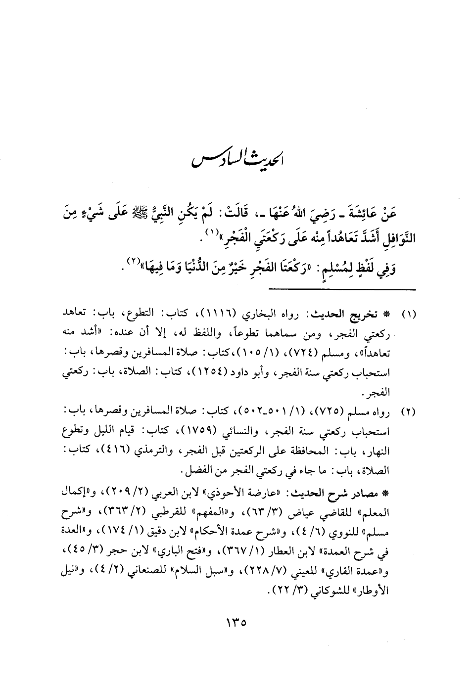 عَنْ عَائِشَةَ - رَضِيَ اللهُ عَنْهَا -، قَالَتْ: لَمْ يَكُنِ النَّبِيُّ - صلى الله عليه وسلم - عَلَى شَيْءٍ مِنَ النَّوافِلِ أَشَدَّ تَعَاهُدًا مِنْه عَلَى رَكْعَتَيِ الْفَجْرِ" (١).