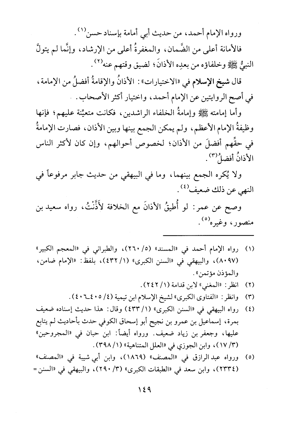 وصح عن عمر: لو أُطيقُ الأذانَ مع الخلافة لأَذَّنْتُ، رواه سعيد بن منصور، وغيره (٥).