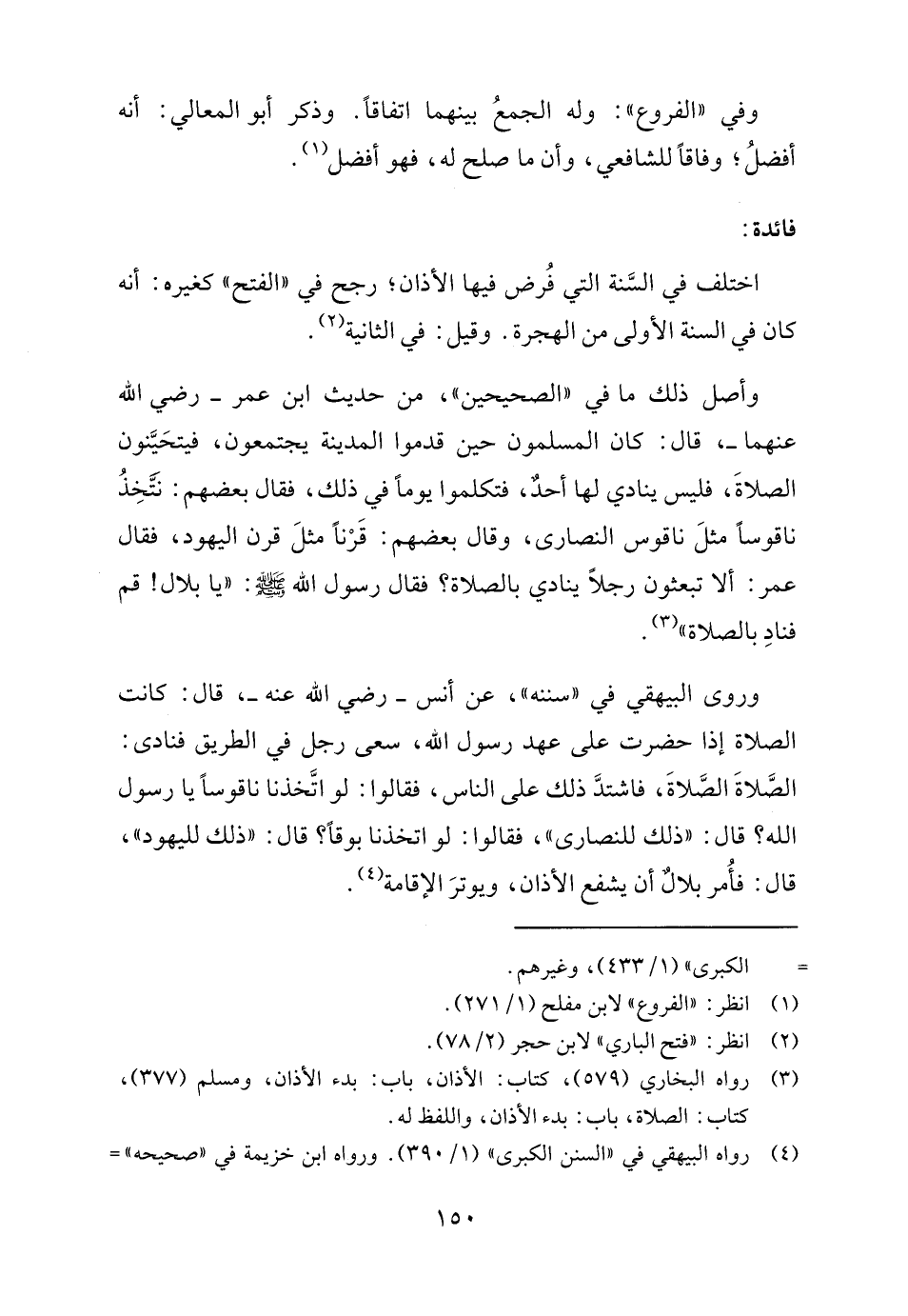 وأصل ذلك ما في "الصحيحين"، من حديث ابن عمر - رضي الله عنهما -، قال: كان المسلمون حين قدموا المدينة يجتمعون، فيتحَيَّنون الصلاةَ، فليس ينادي لها أحدٌ، فتكلموا يومًا في ذلك، فقال بعضهم: نتَّخِذُ ناقوسًا مثلَ ناقوس النصارى، وقال بعضهم: قَرْنًا مثلَ قرن اليهود، فقال عمر: ألا تبعثون رجلًا ينادي بالصلاة؟ فقال رسول الله - صلى الله عليه وسلم -: "يا بلال! قم فنادِ بالصلاة" (٣).