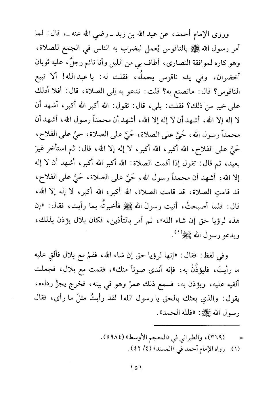 وروى الإمام أحمد، عن عبد الله بن زيد - رضي الله عنه -، قال: لما أمر رسول الله - صلى الله عليه وسلم - بالناقوس يُعمل ليضرب به الناس في الجمع للصلاة، وهو كاره لموافقة النصارى، أطاف بي من الليل وأنا نائم رجلٌ، عليه ثوبان أخضران، وفي يده ناقوس يحملُه، فقلت له: يا عبد الله! ألا تبيع الناقوس؟ قال: ما تصنع به؟ قلت: ندعو به إلى الصلاة، قال: أفلا أدلك على خير من ذلك؟ فقلت: بلى، قال: تقول: الله أكبر الله أكبر، أشهد أن لا إله إلا الله، أشهد أن لا إله إلا الله، أشهد أن محمدًا رسول الله، أشهد أن محمدًا رسول الله، حَيَّ على الصلاة، حَيَّ على الصلاة، حيَّ على الفلاح، حَيَّ على الفلاح، الله أكبر، الله أكبر، لا إله إلا الله، قال: ثم استأخر غيرَ بعيد، ثم قال: تقول إذا أقمت الصلاة: الله أكبر الله أكبر، أشهد أن لا إله إلا الله، أشهد أن محمدًا رسول الله، حَيَّ على الصلاة، حَيَّ على الفلاح، قد قامتِ الصلاة، قد قامت الصلاة، الله أكبر، الله أكبر، لا إله إلا الله، قال: فلما أصبحتُ، أتيت رسولَ الله - صلى الله عليه وسلم - فأخبرتُه بما رأيت، فقال: "إن هذه لرؤيا حق إن شاء الله"، ثم أمر بالتأذين، فكان بلال يؤذن بذلك، ويدعو رسول الله - صلى الله عليه وسلم - (١).