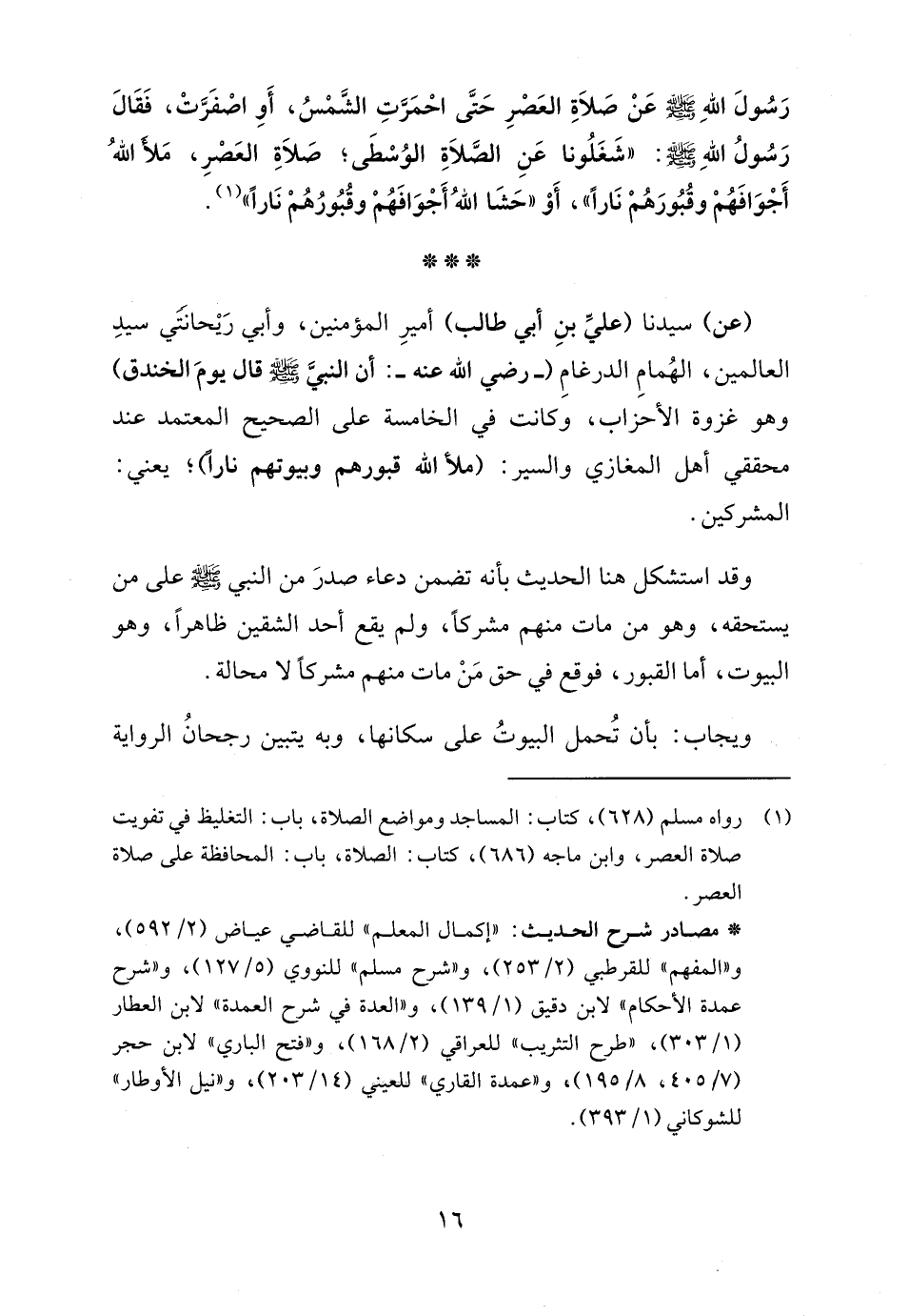 رَسُولَ اللهِ - صلى الله عليه وسلم - عَنْ صَلاَةِ العَصْرِ حَتَّى احْمَرتِ الشَّمْسُ، أَوِ اصْفَرَّتْ، فَقَالَ رَسُولُ اللهِ - صلى الله عليه وسلم -: "شَغَلُونا عَنِ الصَّلاَةِ الوُسْطَى؛ صَلاَةِ العَصْرِ، مَلا اللهُ أَجْوَافَهُمْ وقُبُورَهُمْ نَارًا"، أَوْ "حَشَا اللهُ أَجْوَافَهُمْ وقُبُورُهُمْ نَارًا" (١).