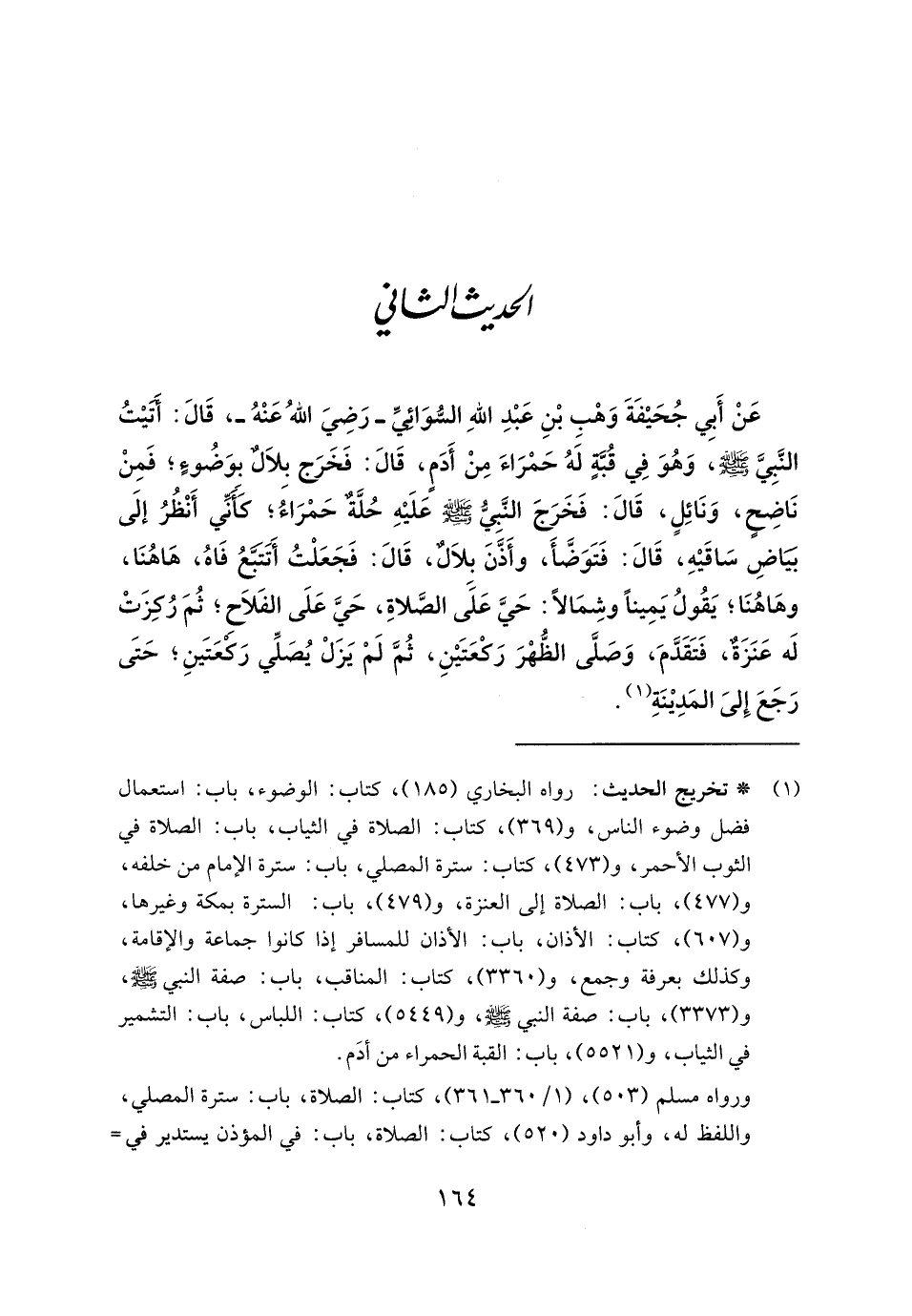 عَنْ أَبِي جُحَيْفَةَ وَهْبِ بْنِ عَبْدِ اللهِ السُّوَائيِّ - رَضِيَ اللهُ عَنْهُ -، قَالَ: أَتيْتُ النَّبِيَّ - صلى الله عليه وسلم -، وَهُوَ في قُبةٍ لَهُ حَمْرَاءَ مِنْ أَدَم، قَالَ: فَخَرَج بلاَلٌ بوَضُوءً؛ فَمِنْ نَاضِحٍ، وَنَائِلٍ، قَالَ: فَخَرَجَ النَّبِيُّ - صلى الله عليه وسلم - علَيْهِ حُلَّةٌ حَمْرَاءُ؛ كَأَنَي أَنْظُرُ إلَى بيَاضِ سَاقَيْهِ، قَالَ: فَتَوَضَّأَ، وأَذَّنَ بلاَلٌ، قَالَ: فَجَعَلْتُ أَتَتبَّعُ فَاهُ، هَاهُنَا، وهَاهُنَا؛ يَقُولُ يَمِينًا وشِمَالًا: حَيَّ عَلَى الصَّلاةِ، حَيَّ عَلَى الفَلاَح؛ ثُمَ رُكزَتْ لَه عَنَزَةٌ، فَتَقَدَّمَ، وَصَلَّى الظُّهْرَ رَكعَتَيْنِ، ثُمَّ لَمْ يَزَلْ يُصَلِّي رَكعَتَينِ؛ حَتَى رَجَعَ إِلىَ المَدِيْنَةِ (١).