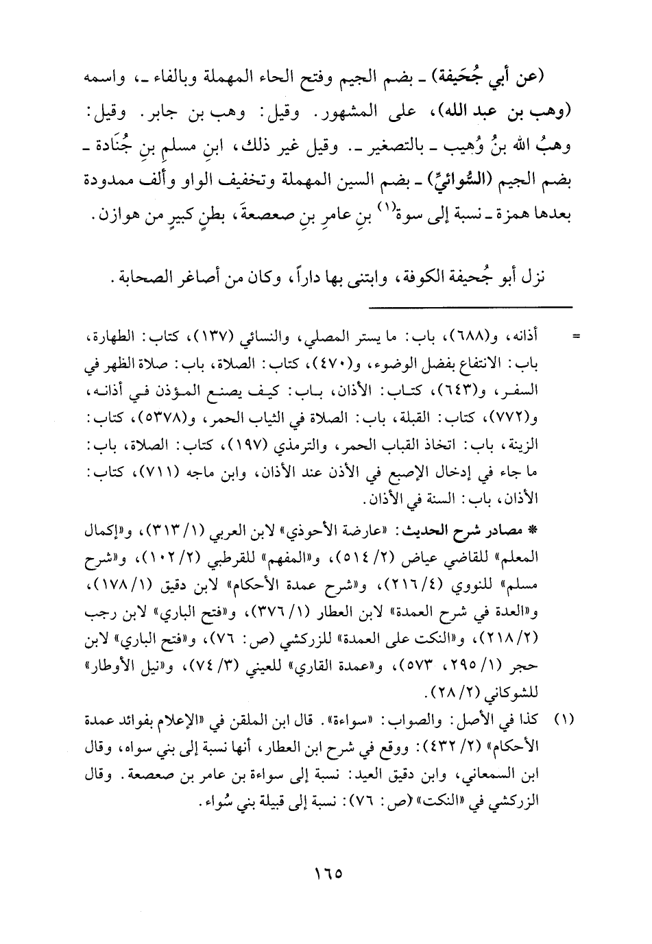 (عن أبي جُحَيفة) -بضم الجيم وفتح الحاء المهملة وبالفاء-، واسمه (وهب بن عبد الله)، على المشهور. وقيل: وهب بن جابر. وقيل: وهبُ الله بنُ وُهيب -بالتصغير-. وقيل غير ذلك، ابنِ مسلمِ بنِ جُنَادة - بضم الجيم (السُّوائيِّ) -بضم السين المهملة وتخفيف الواو وألف ممدودة بعدها همزة- نسبة إلى سوة (١) بنِ عامرِ بنِ صعصعةَ، بطنٍ كبيرٍ من هوازن.