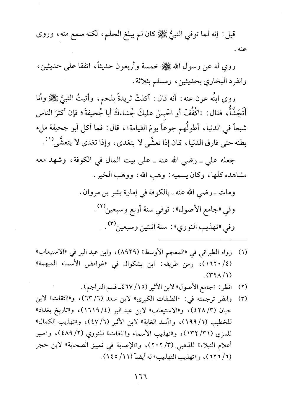 (٣) وانظر ترجمته في: "الطبقات الكبرى" لابن سعد (٦/ ٦٣)، و"الثقات" لابن حبان (٣/ ٤٢٨)، و"الاستيعاب" لابن عبد البر (٤/ ١٦١٩)، و"تاريخ بغداد" للخطيب (١/ ١٩٩)، و"أسد الغابة" لابن الأثير (٦/ ٤٧)، و"تهذيب الكمال" للمزي (٣١/ ١٣٢)، و"تهذيب الأسماء واللغات" للنووي (٢/ ٤٨٩)، و"سير أعلام النبلاء" للذهبي (٣/ ٢٠٢)، و"الإصابة في تمييز الصحابة" لابن حجر (٦/ ٦٢٦)، و"تهذيب التهذيب" له أيضاً (١١/ ١٤٥).