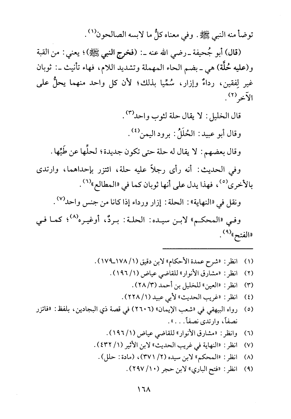 وفي "المحكم" لابن سيده: الحلة: بردٌ، أوغيره (٨)؛ كما في "الفتح" (٩).