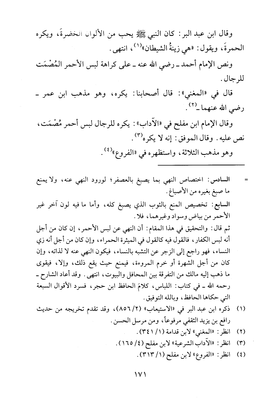 وقال الإمام ابن مفلح في "الآداب": يكره للرجال لبس أحمر مُصْمَت، نص عليه. وقال الموفق: إنه لا يكره (٣).
