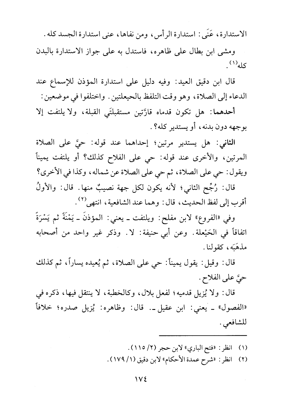 الثاني: هل يستدير مرتين؛ إحداهما عند قوله: حيَّ على الصلاة المرتين، والأخرى عند قوله: حي على الفلاح كذلك؟ أو يلتفت يمينًا ويقول: حي على الصلاة، ثم حي على الصلاة عن شماله، وكذا في الأخرى؟ قال: رُجِّح الثاني؛ لأنه يكون لكل جهة نصيبٌ منها. قال: والأولُ أقرب إلى لفظ الحديث، قال: وهما عند الشافعية، انتهى (٢).
