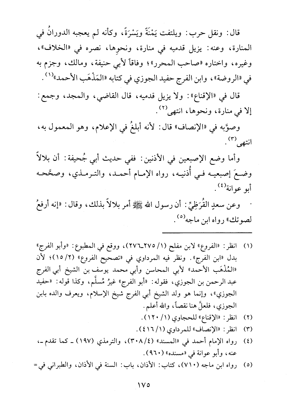 قال: ونقل حرب: ويلتفت يَمْنَةً ويَسْرَةً، وكأنه لم يعجبه الدورانُ في المنارة، وعنه: يزيل قدميه في منارة، ونحوِها، نصره في "الخلاف"، وغيره، واختاره "صاحب المحرر"؛ وفاقًا لأبي حنيفة، ومالك، وجزم به في "الروضة"، وابن الفرج حفيد الجوزي في كتابه "المَذْهَب الأحمد" (١).