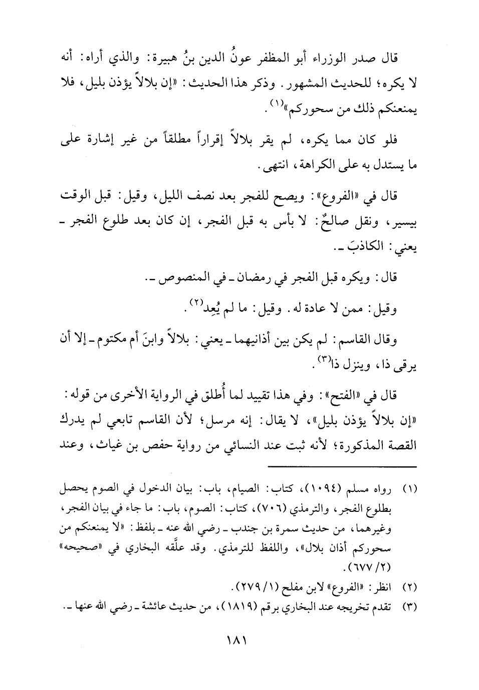 قال صدر الوزراء أبو المظفر عونُ الدين بنُ هبيرة: والذي أراه: أنه لا يكره؛ للحديث المشهور. وذكر هذا الحديث: "إن بلالًا يؤذن بليل، فلا يمنعنكم ذلك من سحوركم" (١).