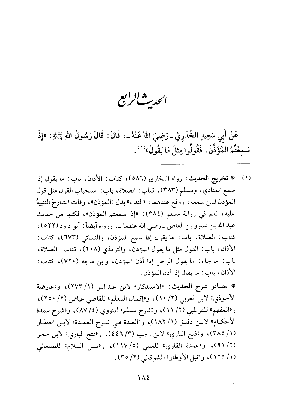 عَنْ أَبِي سَعِيدٍ الخُدْرِيِّ - رَضِيَ اللهُ عَنْهُ -، قَالَ: قَالَ رَسُولُ اللهِ - صلى الله عليه وسلم -: "إِذَا سَمِعْتُمُ المُؤَذِّنَ، فَقُولُوا مِثْلَ مَا يَقُولُ" (١).