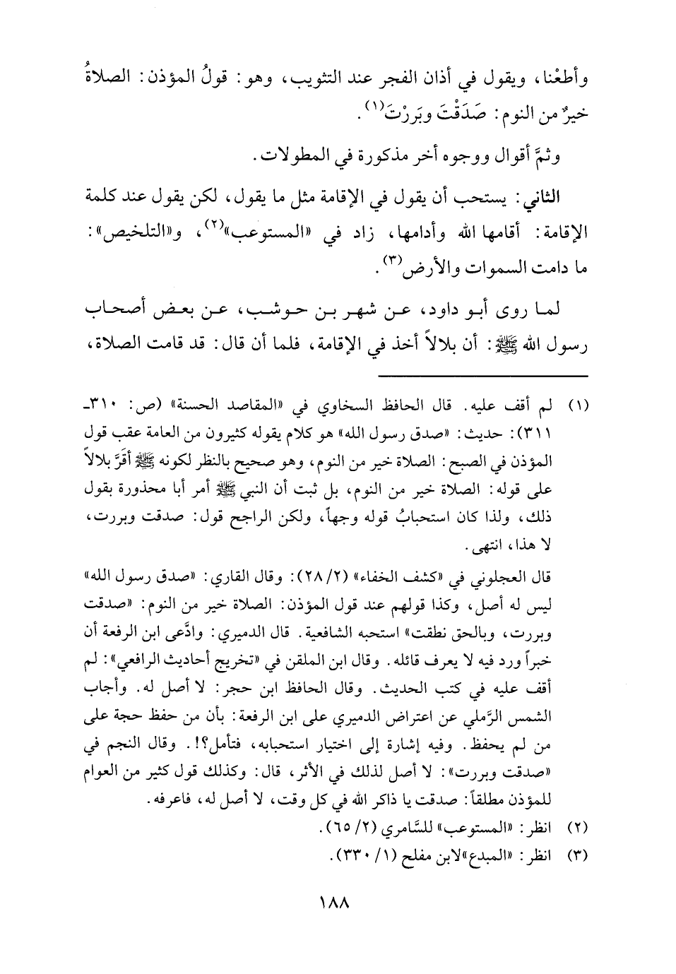 (١) لم أقف عليه. قال الحافظ السخاوي في "المقاصد الحسنة" (ص: ٣١٠ - ٣١١): حديث: "صدق رسول الله" هو كلام يقوله كثيرون من العامة عقب قول المؤذن في الصبح: الصلاة خير من النوم، وهو صحيح بالنظر لكونه - صلى الله عليه وسلم - أقَرَّ بلالًا على قوله: الصلاة خير من النوم، بل ثبت أن النبي - صلى الله عليه وسلم - أمر أبا محذورة بقول ذلك، ولذا كان استحبابُ قوله وجهًا، ولكن الراجح قول: صدقت وبررت، لا هذا، انتهى.
