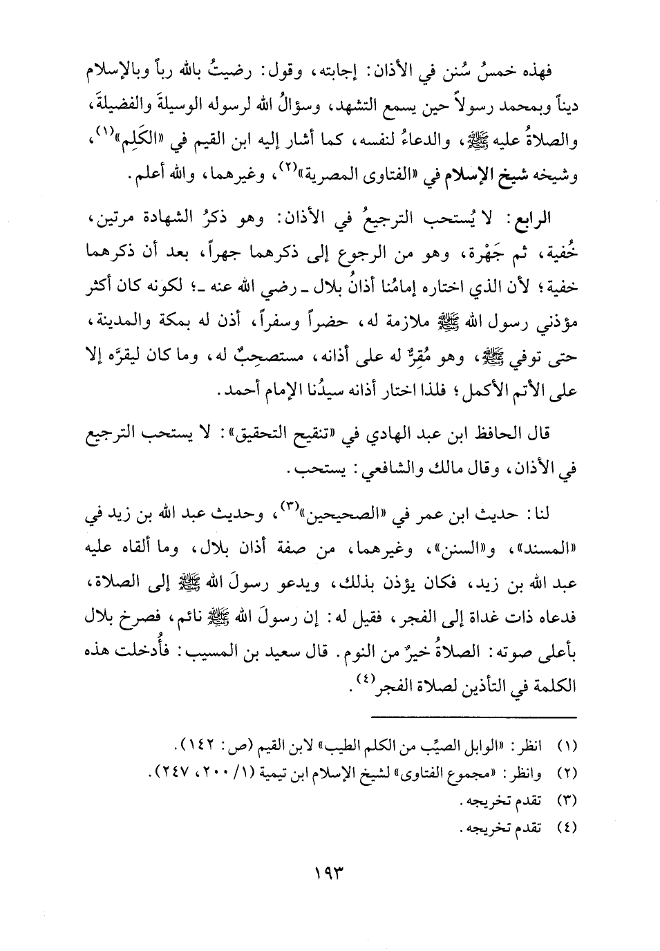 الرابع: لا يُستحب الترجيعُ في الأذان: وهو ذكرُ الشهادة مرتين، خُفية، ثم جَهْرة، وهو من الرجوع إلى ذكرهما جهرًا، بعد أن ذكرهما خفية؛ لأن الذي اختاره إمامُنا أذانُ بلال - رضي الله عنه -؛ لكونه كان أكثر مؤذني رسول الله - صلى الله عليه وسلم - ملازمة له، حضرًا وسفرًا، أذن له بمكة والمدينة، حتى توفي - صلى الله عليه وسلم -، وهو مُقِرٌّ له على أذانه، مستصحِبٌ له، وما كان ليقرَّه إلا على الأتم الأكمل؛ فلذا اختار أذانه سيدُنا الإمام أحمد.