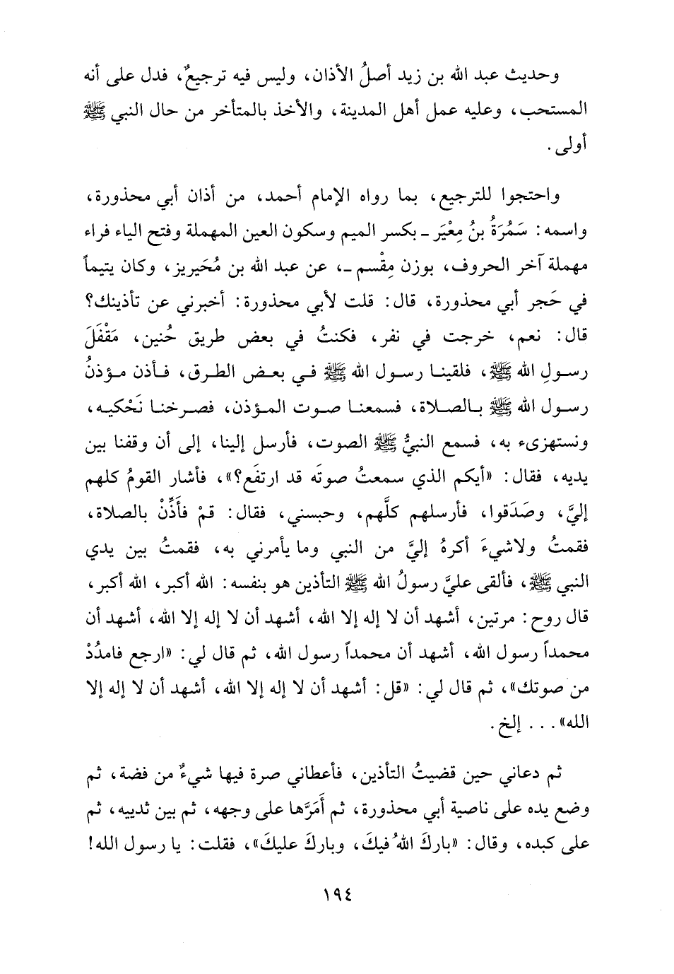 واحتجوا للترجيع، بما رواه الإمام أحمد، من أذان أبي محذورة، واسمه: سَمُرَةُ بنُ مِعْيَر -بكسر الميم وسكون العين المهملة وفتح الياء فراء مهملة آخر الحروف، بوزن مِقْسم-، عن عبد الله بن مُحَيريز، وكان يتيمًا في حَجر أبي محذورة، قال: قلت لأبي محذورة: أخبرني عن تأذينك؟ قال: نعم، خرجت في نفر، فكنتُ في بعض طريق حُنين، مَقْفَلَ رسولِ الله - صلى الله عليه وسلم -، فلقينا رسول الله - صلى الله عليه وسلم - في بعض الطرق، فأذن مؤذنُ رسول الله - صلى الله عليه وسلم - بالصلاة، فسمعنا صوت المؤذن، فصرخنا نَحْكيه، ونستهزىء به، فسمع النبيُّ - صلى الله عليه وسلم - الصوت، فأرسل إلينا، إلى أن وقفنا بين يديه، فقال: "أيكم الذي سمعتُ صوتَه قد ارتفَع؟ "، فأشار القومُ كلهم إليَّ، وصَدَقوا، فأرسلهم كلَّهم، وحبسني، فقال: قمْ فأَذِّنْ بالصلاة، فقمتُ ولا شيءَ أكرهُ إليَّ من النبي وما يأمرني به، فقمتُ بين يدي النبي - صلى الله عليه وسلم -، فألقى على رسولُ الله - صلى الله عليه وسلم - التأذين هو بنفسه: الله أكبر، الله أكبر، قال روح: مرتين، أشهد أن لا إله إلا الله، أشهد أن لا إله إلا الله، أشهد أن محمدًا رسول الله، أشهد أن محمدًا رسول الله، ثم قال لي: "ارجع فامدُدْ من صوتك"، ثم قال لي: "قل: أشهد أن لا إله إلا الله، أشهد أن لا إله إلا الله " ... إلخ.