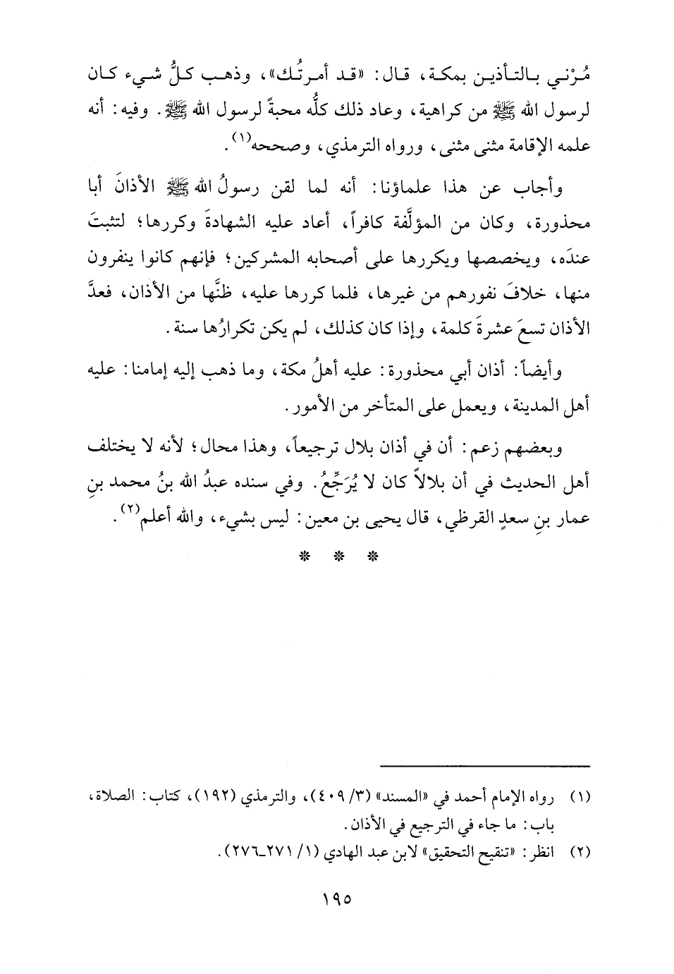 وبعضهم زعم: أن في أذان بلال ترجيعًا، وهذا محال، لأنه لا يختلف أهل الحديث في أن بلالًا كان لا يُرَجِّعُ. وفي سنده عبدُ الله بنُ محمد بنِ عمار بنِ سعدٍ القرظي، قال يحيى بن معين: ليس بشيء، والله أعلم (٢).