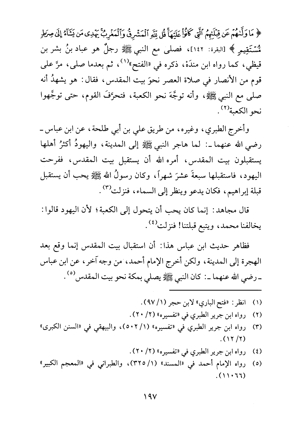وأخرج الطبري، وغيره، من طريق علي بن أبي طلحة، عن ابن عباس- رضي الله عنهما -: لما هاجر النبي - صلى الله عليه وسلم - إلى المدينة، واليهودُ أكثرُ أهلها يستقبلون بيت المقدس، أمره الله أن يستقبل بيت المقدس، ففرحت اليهود، فاستقبلها سبعةَ عشرَ شهرًا، وكان رسولُ الله - صلى الله عليه وسلم - يحب أن يستقبل قبلة إبراهيم، فكان يدعو وينظر إلى السماء، فنزلت (٣).
