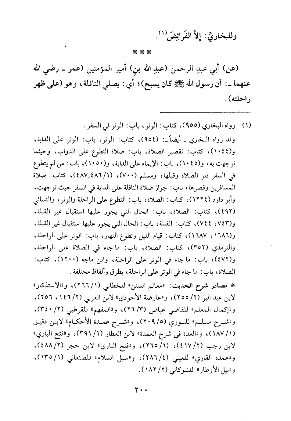 (عن) أبي عبدِ الرحمن (عبدِ الله بنِ) أمير المؤمنين (عمر - رضي الله عنهما -: أن رسول الله - صلى الله عليه وسلم - كان يسبح)؛ أي: يصلي النافلة، وهو (على ظهر راحلته).