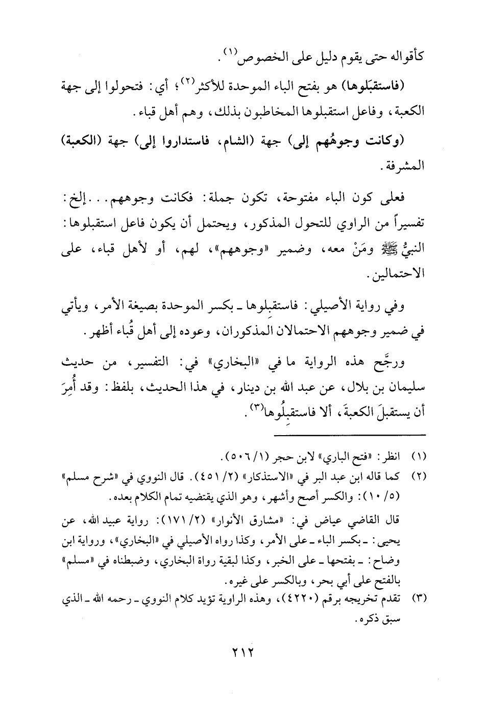 (فاستقبَلوها) هو بفتح الباء الموحدة للأكثر (٢)؛ أي: فتحولوا إلى جهة الكعبة، وفاعل استقبلوها المخاطبون بذلك، وهم أهل قباء.