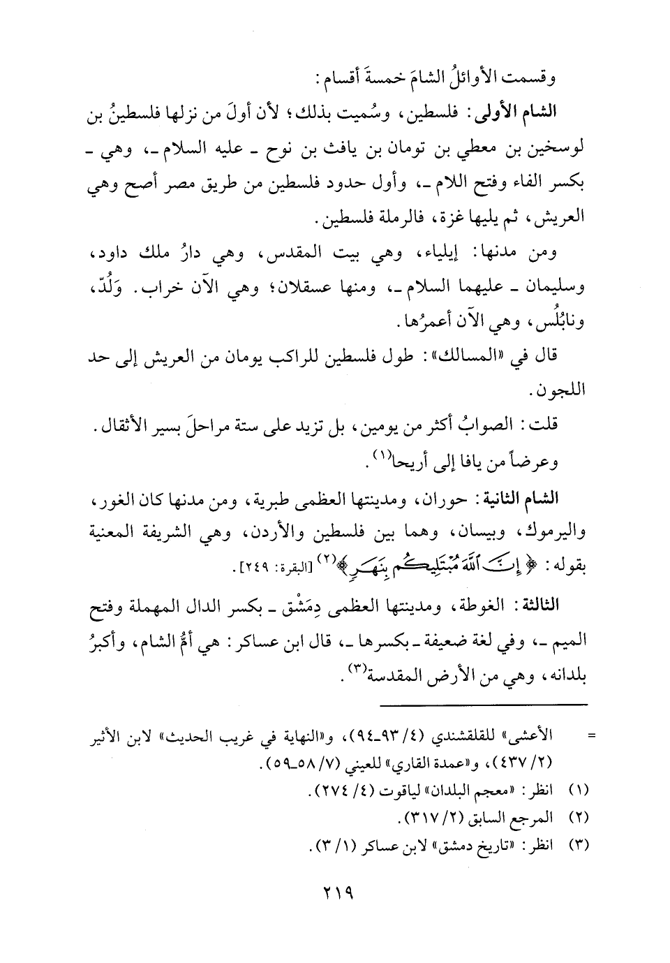 الشام الأولى: فلسطين، وسُميت بذلك؛ لأن أولَ من نزلها فلسطينُ بن لوسخين بن معطي بن تومان بن يافث بن نوح - عليه السلام -، وهي - بكسر الفاء وفتح اللام -، وأول حدود فلسطين من طريق مصر أصح وهي العريش، ثم يليها غزة، فالرملة فلسطين.