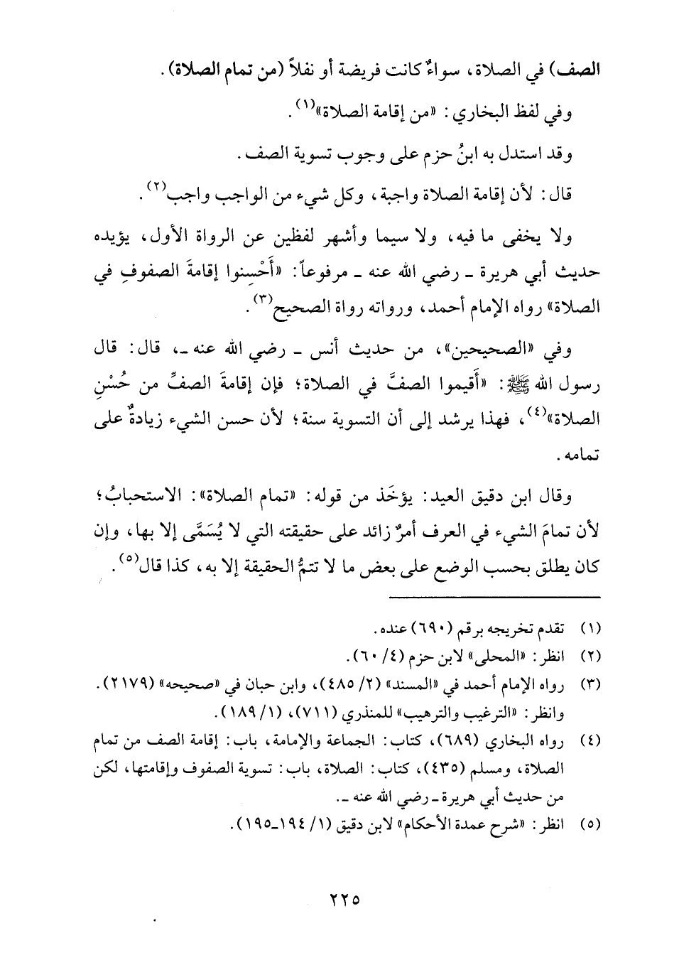 ولا يخفى ما فيه، ولا سيما وأشهر لفظين عن الرواة الأول، يؤيده حديث أبي هريرة - رضي الله عنه - مرفوعًا: "أَحْسِنوا إقامةَ الصفوفِ في الصلاة" رواه الإمام أحمد، ورواته رواة الصحيح (٣).