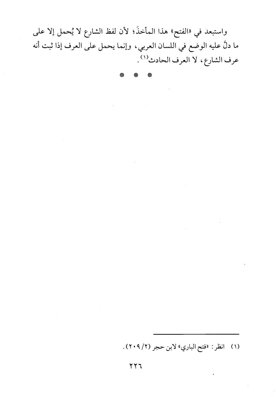 واستبعد في "الفتح" هذا المأخذَ؛ لأن لفظ الشارع لا يُحمل إلا على ما دلَّ عليه الوضع في اللسان العربي، وإنما يحمل على العرف إذا ثبت أنه عرف الشارع، لا العرف الحادث (١).