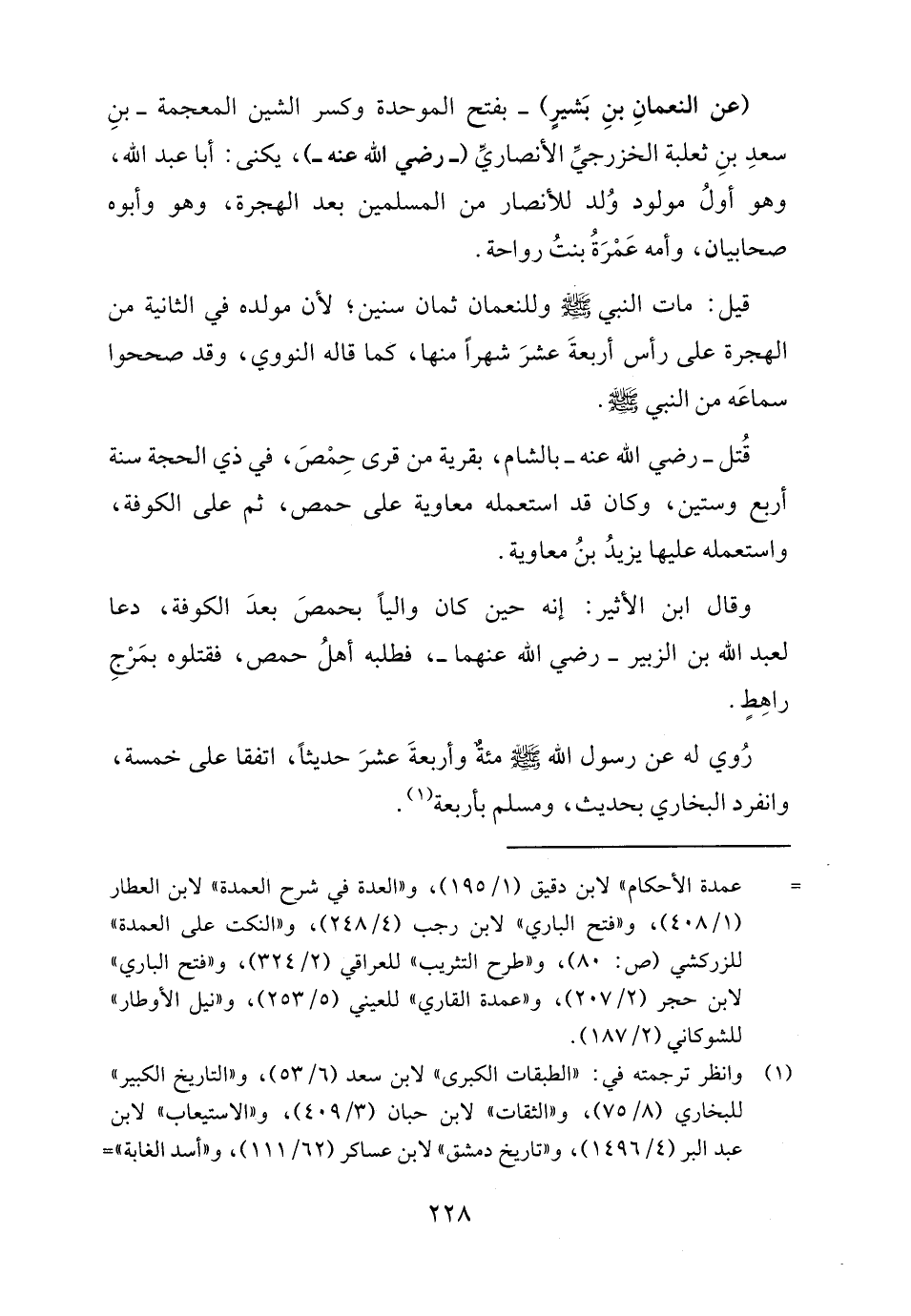 (عن النعمانِ بنِ بَشيرٍ) -بفتح الموحدة وكسر الشين المعجمة - بنِ سعدِ بنِ ثعلبة الخزرجيِّ الأنصاريِّ (- رضي الله عنه -)، يكنى: أبا عبد الله، وهو أولُ مولود وُلد للأنصار من المسلمين بعد الهجرة، وهو وأبوه صحابيان، وأمه عَمْرَةُ بنت رواحة.