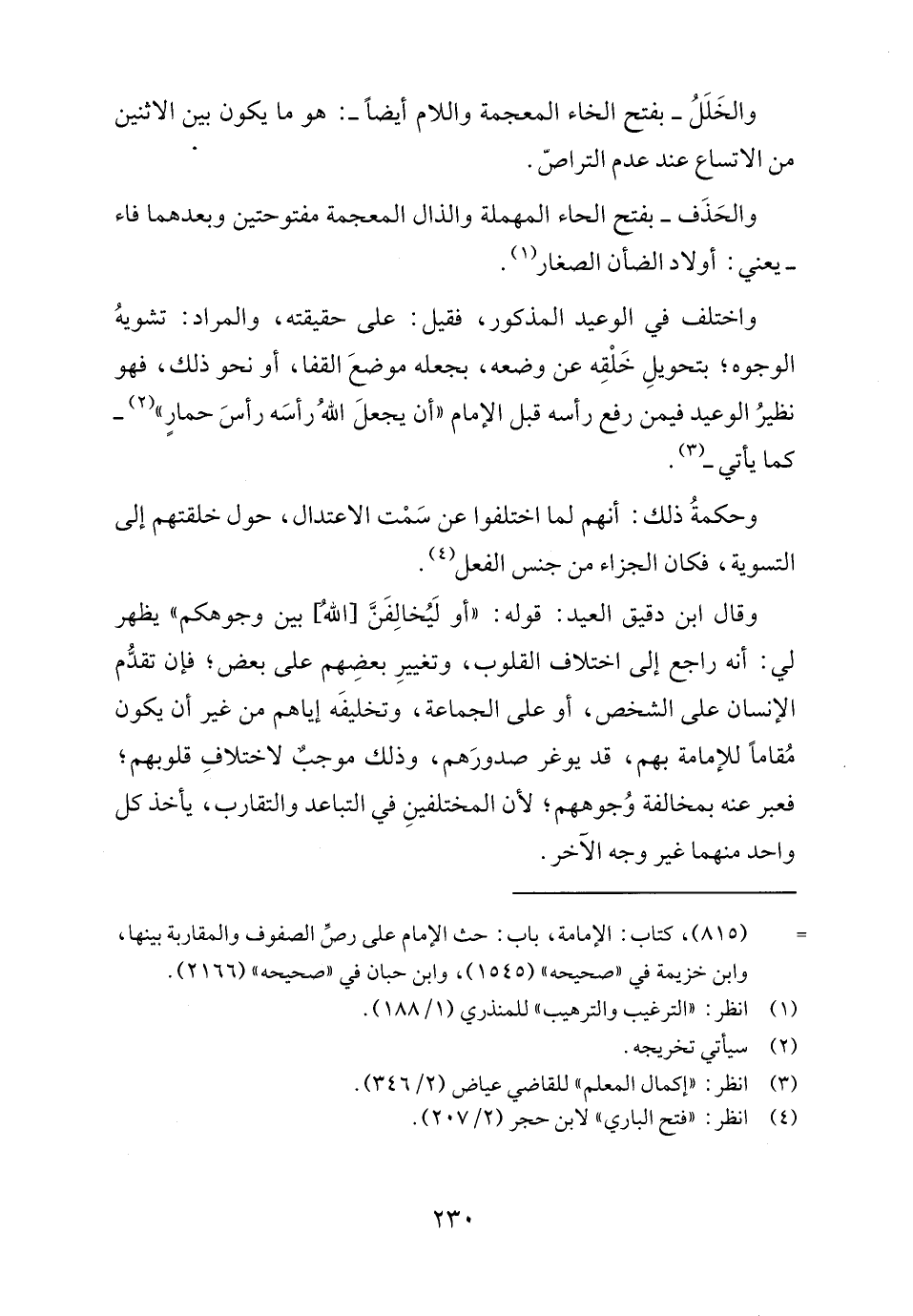 وقال ابن دقيق العيد: قوله: "أو لَيُخالِفَنَّ [اللهُ] بين وجوهكم" يظهر لي: أنه راجع إلى اختلاف القلوب، وتغييرِ بعضِهم على بعض؛ فإن تقدُّم الإنسان على الشخص، أو على الجماعة، وتخليفَه إياهم من غير أن يكون مُقامًا للإمامة بهم، قد يوغر صدورَهم، وذلك موجبٌ لاختلافِ قلوبهم؛ فعبر عنه بمخالفة وُجوههم؛ لأن المختلفينِ في التباعد والتقارب، يأخذ كل واحد منهما غير وجه الآخر.