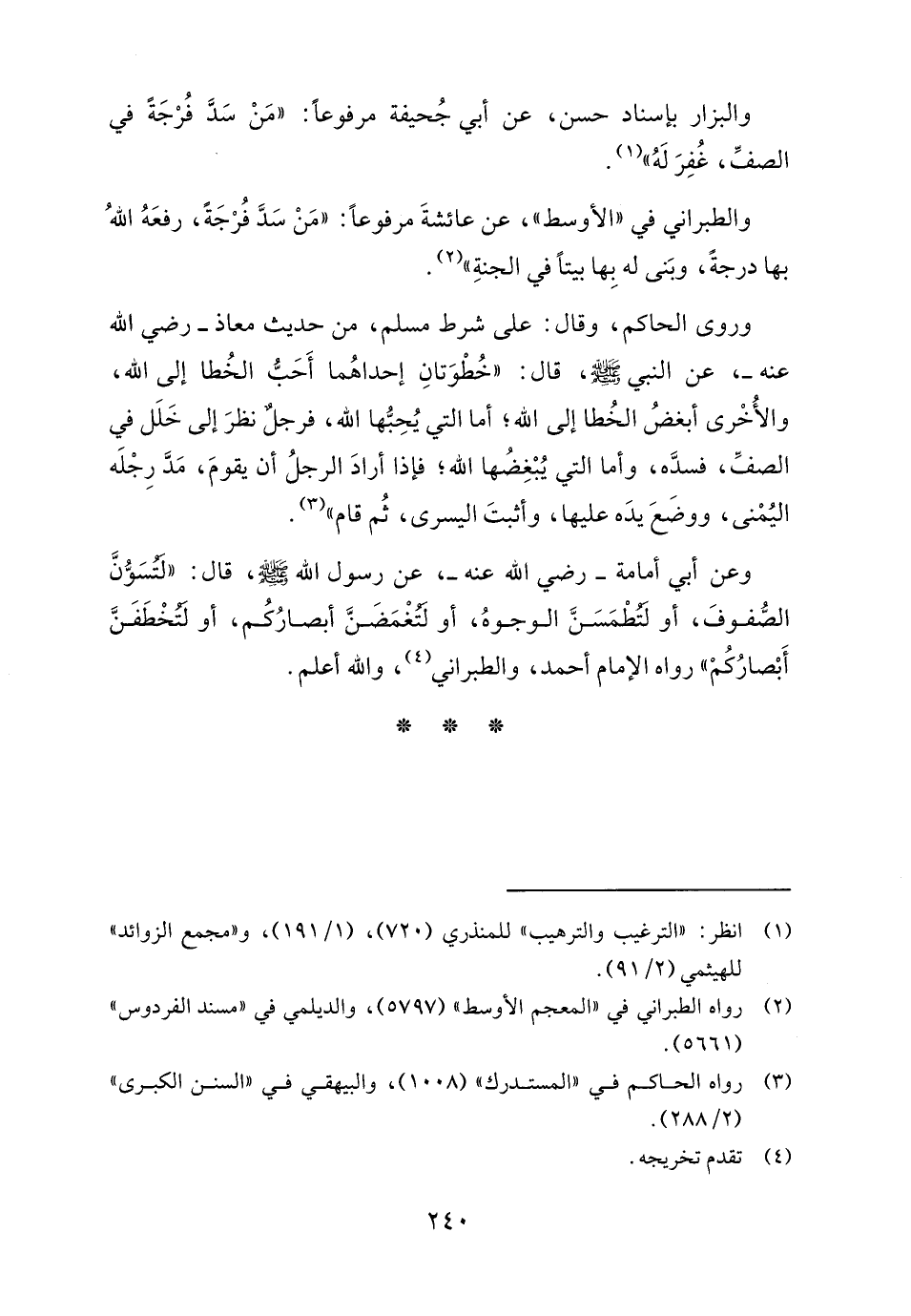 والبزار بإسناد حسن، عن أبي جُحيفة مرفوعًا: "مَنْ سَدَّ فُرْجَةً في الصفِّ، غُفِرَ لَهُ" (١).