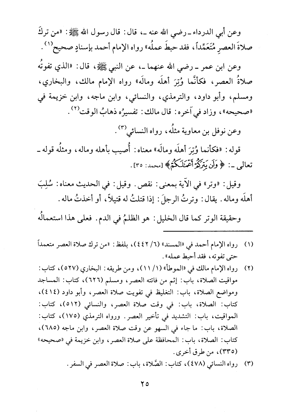 وعن ابن عمر - رضي الله عنهما -، عن النبي - صلى الله عليه وسلم -، قال: "الذي تفوتُه صلاةُ العصر، فكأنَّما وُتِرَ أهلَه ومالَه" رواه الإمام مالك، والبخارى، ومسلم، وأبو داود، والترمذي، والنسائي، وابن ماجه، وابن خزيمة في "صحيحه"، وزاد في آخره: قال مالك: تفسيرُه ذهابُ الوقت (٢).