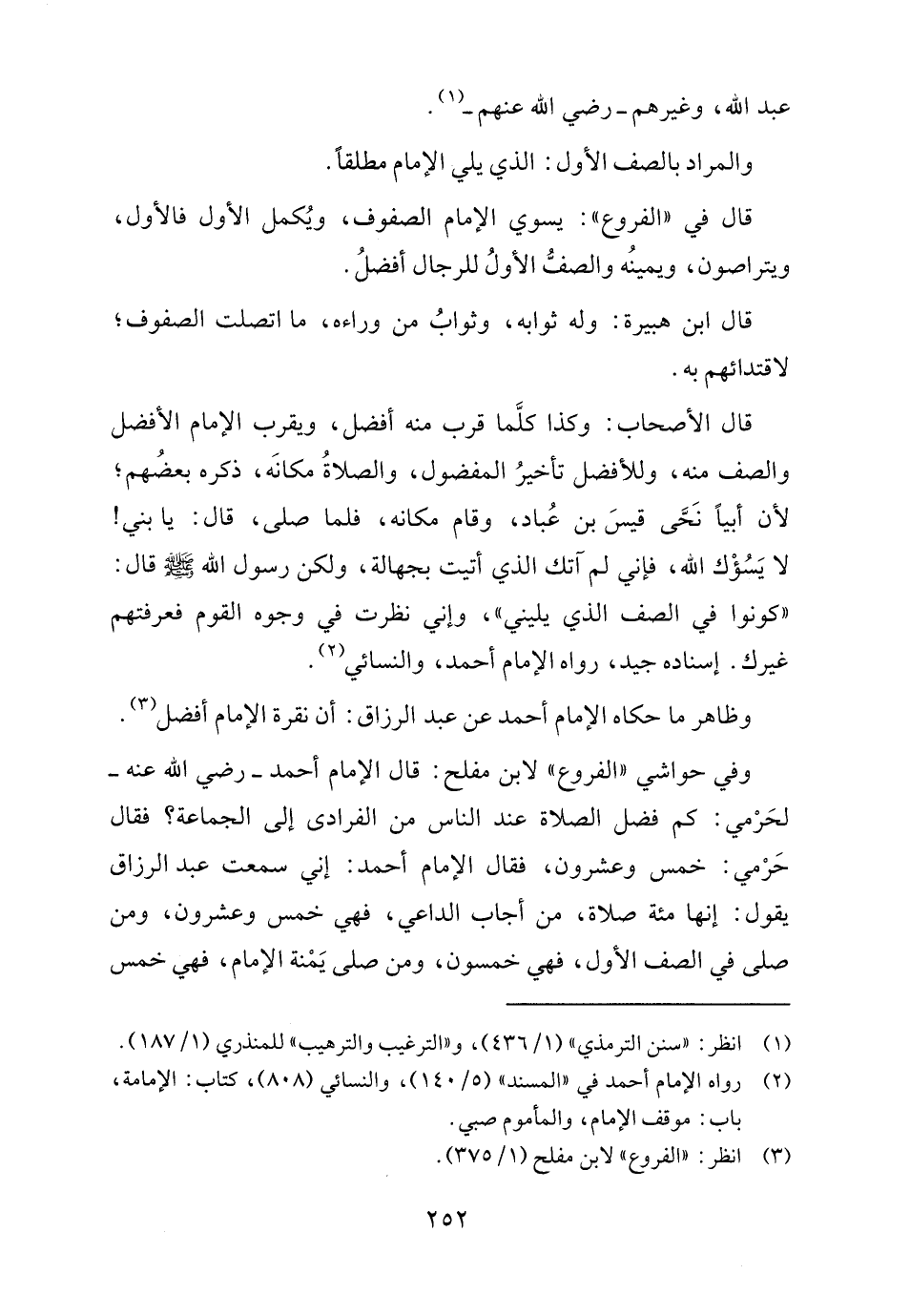 وفي حواشي "الفروع" لابن مفلح: قال الإمام أحمد- رضي الله عنه - لحَرْمي: كم فضل الصلاة عند الناس من الفرادى إلى الجماعة؟ فقال حَرْمي: خمس وعشرون، فقال الإمام أحمد: إني سمعت عبد الرزاق يقول: إنها مئة صلاة، من أجاب الداعي، فهي خمس وعشرون، ومن صلى في الصف الأول، فهي خمسون، ومن صلى يَمْنة الإمام، فهي خمس