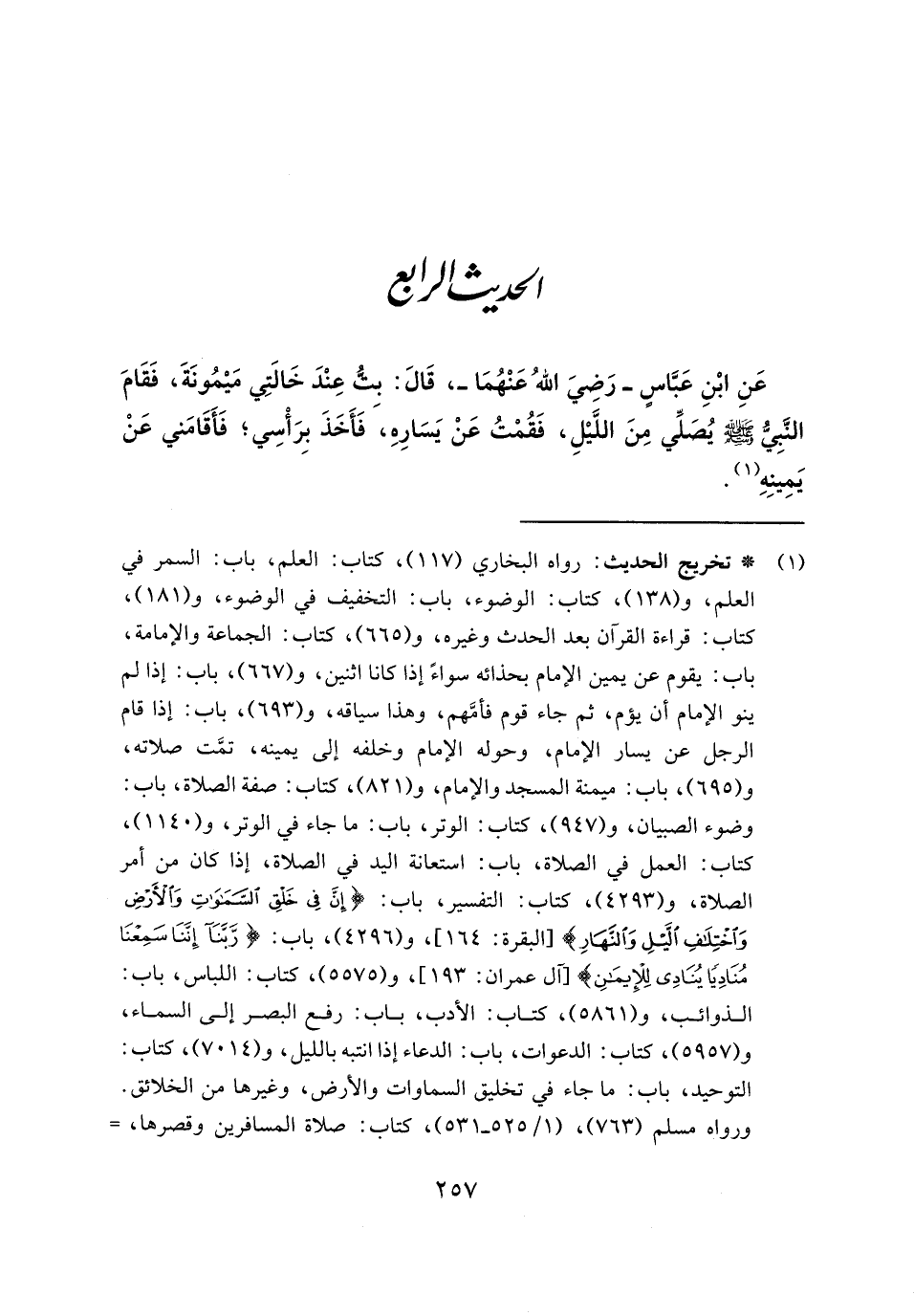 عَنِ ابْنِ عَبَّاسٍ - رَضِيَ اللهُ عَنْهُمَا -، قَالَ: بتُّ عِنْدَ خَالَتِي مَيْمُونَةَ، فَقَامَ النَّبِيُّ - صلى الله عليه وسلم - يُصَلِّي مِنَ اللَّيْلِ، فَقُمْتُ عَنْ يَسَارِهِ، فَأَخَذَ بِرَأْسِي؛ فَأَقَامَني عَنْ يَمِينِهِ (١).